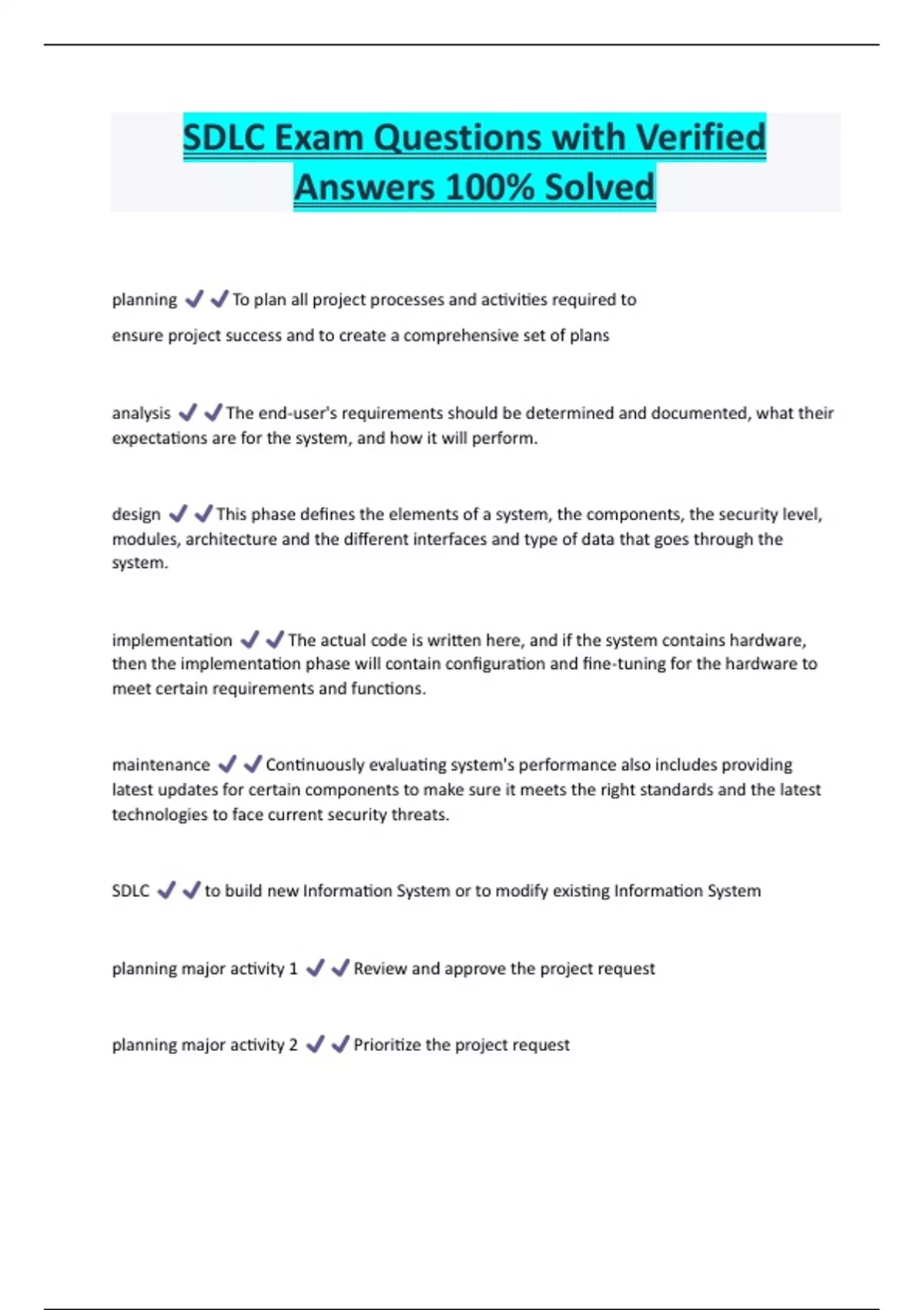 SDLC Exam Questions with Verified Answers 100% Solved planning To plan all project processes and activities required to ensure project success and to create a comprehensive set of plans analysis The end-user's requirements should be determined and documented, what their expectations are for the system, and how it will perform. design This phase defines the elements of a system, the components, the security level, modules, architecture and the different interfaces and type of data that goes through the system. implementation The actual code is written here, and if the system contains hardware, then the implementation phase will contain configuration and fine-tuning for the hardware to meet certain requirements and function