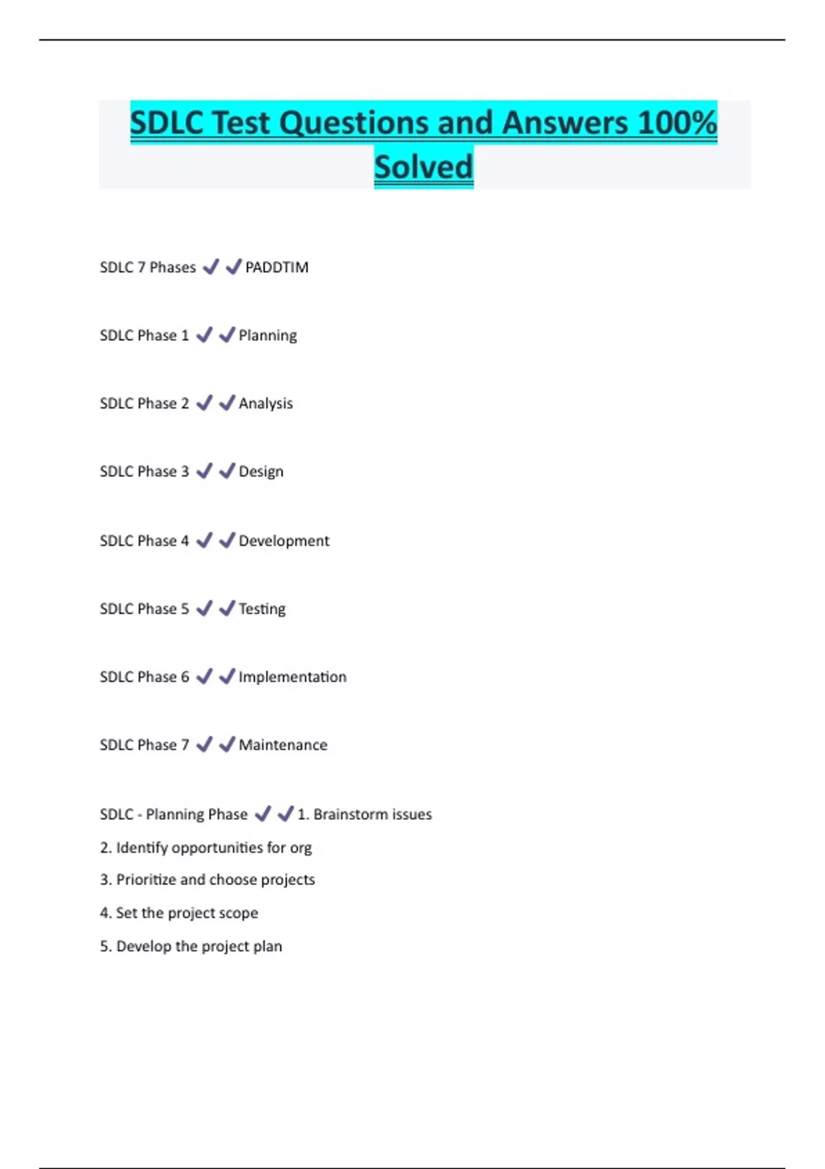 SDLC Test Questions and Answers 100% Solved SDLC 7 Phases PADDTIM SDLC Phase 1 Planning SDLC Phase 2 Analysis SDLC Phase 3 Design SDLC Phase 4 Development SDLC Phase 5 Testing SDLC Phase 6 Implementation SDLC Phase 7 Maintenance