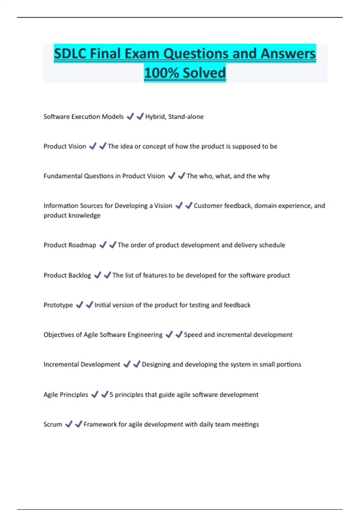 SDLC Final Exam Questions and Answers 100% Solved Software Execution Models Hybrid, Stand-alone Product Vision The idea or concept of how the product is supposed to be Fundamental Questions in Product Vision The who, what, and the why Information Sources for Developing a Vision Customer feedback, domain experience, and product knowledge Product Roadmap The order of product development and delivery schedule Product Backlog The list of features to be developed for the software product Prototype Initial version of the product for testing and feedback Objectives of Agile Software Engineering Speed and incremental development Incremental Development Designing and developing the system in small portions Agile Principles 5 principles that guide agile software developmen