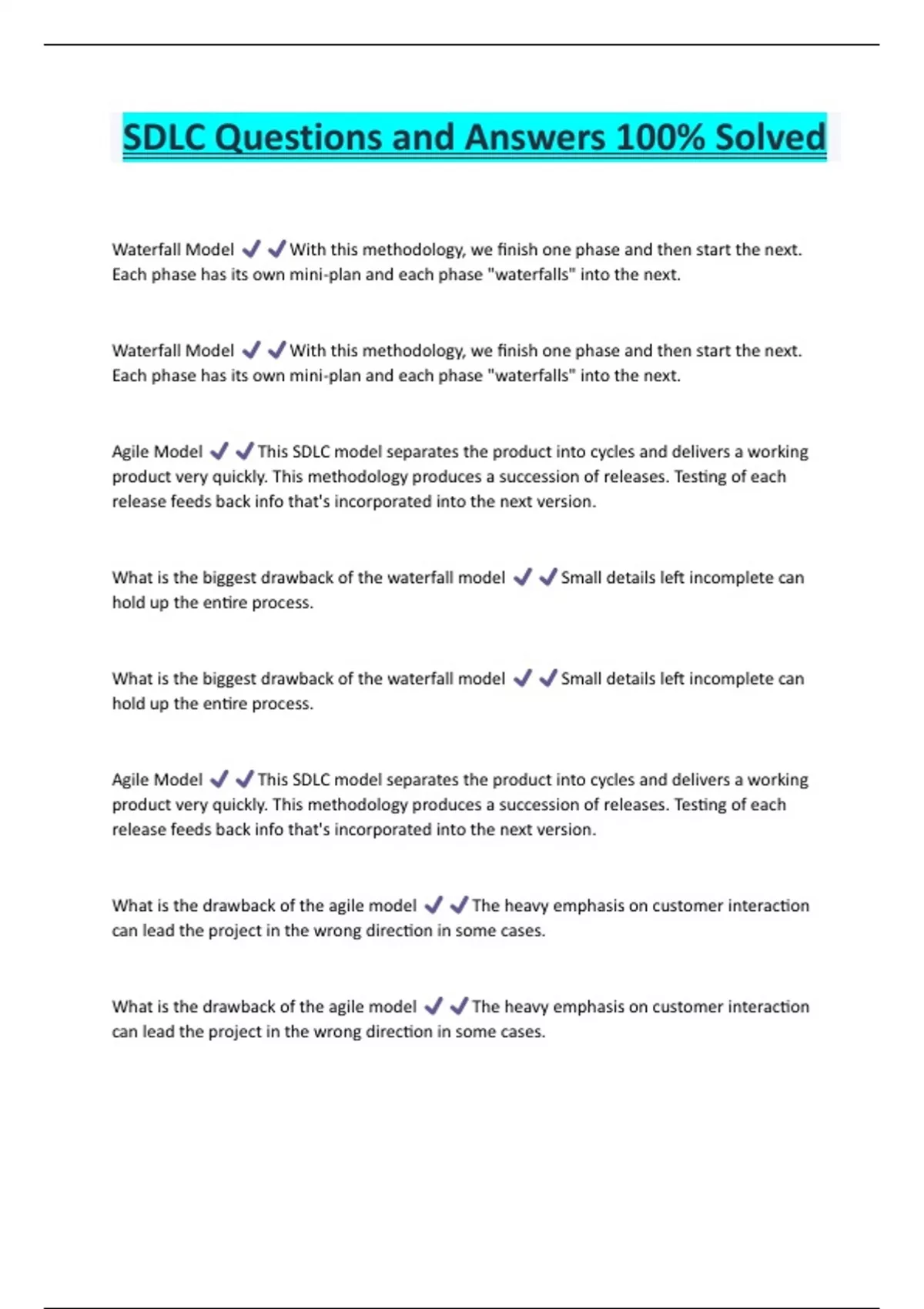 SDLC Questions and Answers 100% Solved Waterfall Model With this methodology, we finish one phase and then start the next. Each phase has its own mini-plan and each phase "waterfalls" into the next. Waterfall Model With this methodology, we finish one phase and then start the next. Each phase has its own mini-plan and each phase "waterfalls" into the next. Agile Model This SDLC model separates the product into cycles and delivers a working product very quickly. This methodology produces a succession of releases. Testing of each release feeds back info that's incorporated into the next version. What is the biggest drawback of the waterfall model Small details left incomplete can hold up the entire process. What is the biggest drawback of the waterfall model Small details left incomplete can hold up the entire process. Agile Model This SDLC model separates the product into cycles and delivers a working product very quickly. This methodology produces a succession of releases. Testing of each release feeds back info that's incorporated into the next version.