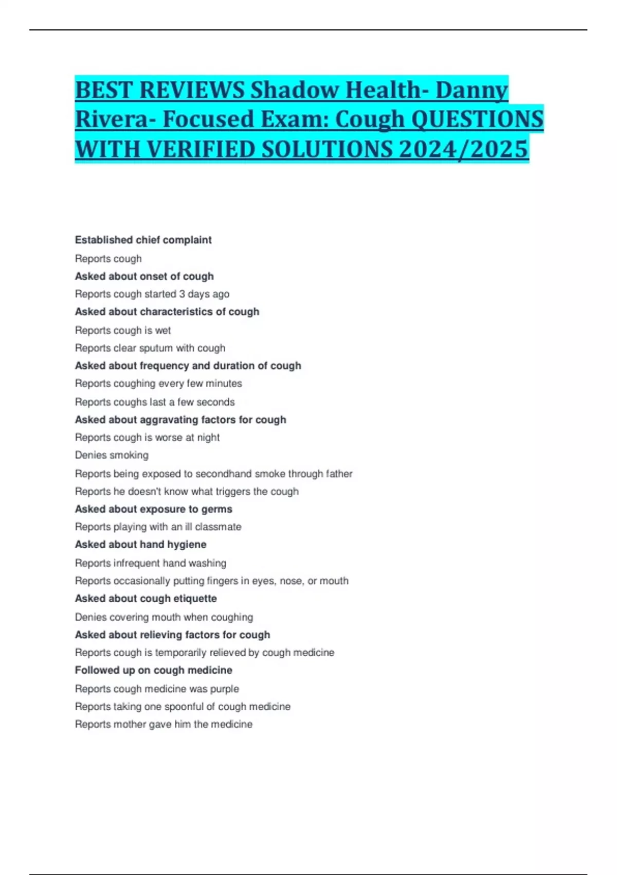 BEST REVIEWS Shadow Health- Danny Rivera- Focused Exam: Cough QUESTIONS WITH VERIFIED SOLUTIONS 2024/2025