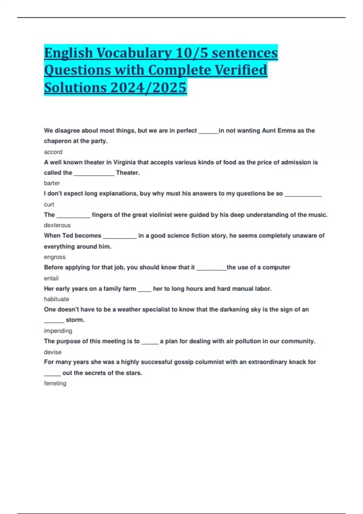 English Vocabulary 10/5 sentences Questions with Complete Verified Solutions 2024/2025