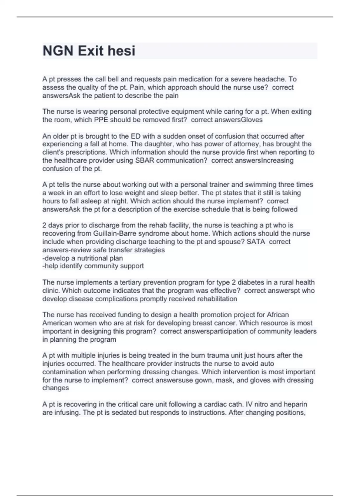 A pt presses the call bell and requests pain medication for a severe headache. To assess the quality of the pt. Pain, which approach should the nurse use? correct answersAsk the patient to describe the pain The nurse is wearing personal protective equipment while caring for a pt. When exiting the room, which PPE should be removed first? correct answersGloves An older pt is brought to the ED with a sudden onset of confusion that occurred after experiencing a fall at home. The daughter, who has power of attorney, has brought the client's prescriptions. Which information should the nurse provide first when reporting to the healthcare provider using SBAR communication? correct answersIncreasing confusion of the pt. A pt tells the nurse about working out with a personal trainer and swimming three times a week in an effort to lose weight and sleep better. The pt states that it still is taking hours to fall asleep at night. Which action should the nurse implement? correct answersAsk the pt for a description of the exercise schedule that is being followed 2 days prior to discharge from the rehab facility, the nurse is teaching a pt who is recovering from Guillain-Barre syndrome about home. Which actions should the nurse include when providing discharge teaching to the pt and spouse? SATA correct answers-review safe transfer strategies -develop a nutritional plan -help identify community support The nurse implements a tertiary prevention program for type 2 diabetes in a rural health clinic. Which outcome indicates that the program was effective? correct answerspt who develop disease complications promptly received rehabilitation The nurse has received funding to design a health promotion project for African American women who are at risk for developing breast cancer. Which resource is most important in designing this program? correct answersparticipation of community leaders in planning the program A pt with multiple injuries is being treated in the burn trauma unit just hours after the injuries occurred. The healthcare provider instructs the nurse to avoid auto contamination when performing dressing changes. Which intervention is most important for the nurse to implement? correct answersuse gown, mask, and gloves with dressing changes A pt is recovering in the critical care unit following a cardiac cath. IV nitro and heparin are infusing. The pt is sedated but responds to instructions. After changing positions,