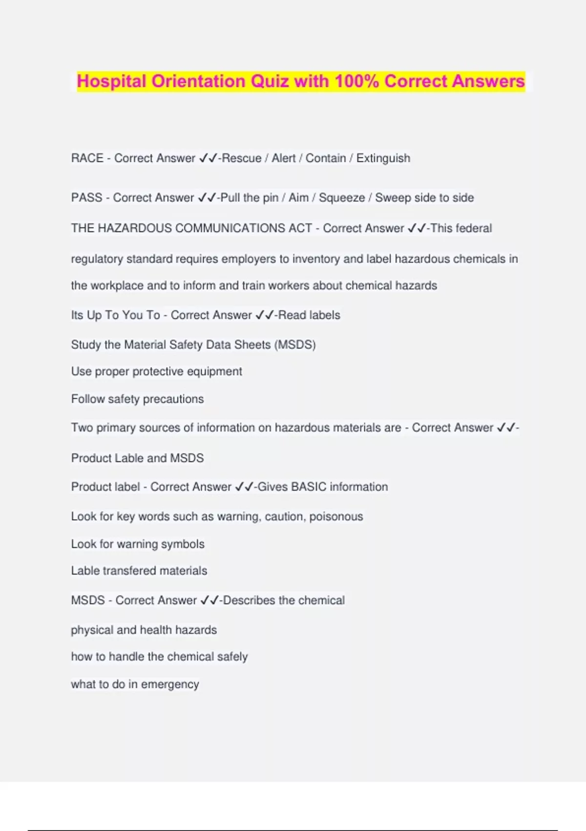 Hospital Orientation Quiz with 100% Correct Answers RACE - Correct Answer ️️ -Rescue / Alert / Contain / Extinguish PASS - Correct Answer ️️ -Pull the pin / Aim / Squeeze / Sweep side to side THE HAZARDOUS COMMUNICATIONS ACT - Correct Answer ️️ -This federal regulatory standard requires employers to inventory and label hazardous chemicals in the workplace and to inform and train workers about chemical hazards Its Up To You To - Correct Answer ️️ -Read labels Study the Material Safety Data Sheets (MSDS) Use proper protective equipment Follow safety precautions Two primary sources of information on hazardous materials are - Correct Answer ️️ - Product Lable and MSDS Product label - Correct Answer ️️ -Gives BASIC information Look for key words such as warning, caution, poisonous Look for warning symbols Lable transfered materials MSDS - Correct Answer ️️ -Describes the chemical physical and health hazards how to handle the chemical safely what to do in emergency Most common injury - Correct Answer ️️ -Lower back strain Lifting - Correct Answer ️️ -1. Keep load close to your body. 2. Bend the knees and hips. 3. Tighten the abdominal muscles when you lift. 4. Avoid twisting as you lift. 5. Lift with legs and buttocks. 6. Maintain natural curves of the back. Pushing and Pulling - Correct Answer ️️ -1. Stay close to the load. 2. Avoid leaning forward. 3. Push rather than pull whenever possible. 4. Use both arms. 5. Tighten stomach muscles when pushing. Reaching - Correct Answer ️️ -1. Reach only as far as is comfortable, usually at shoulder level. 2. Test weight by lifting corner. 3. Let arms and legs do the work, keeping the back straight. 4. Tighten the stomach muscles as you lift. 5. Arrange w
