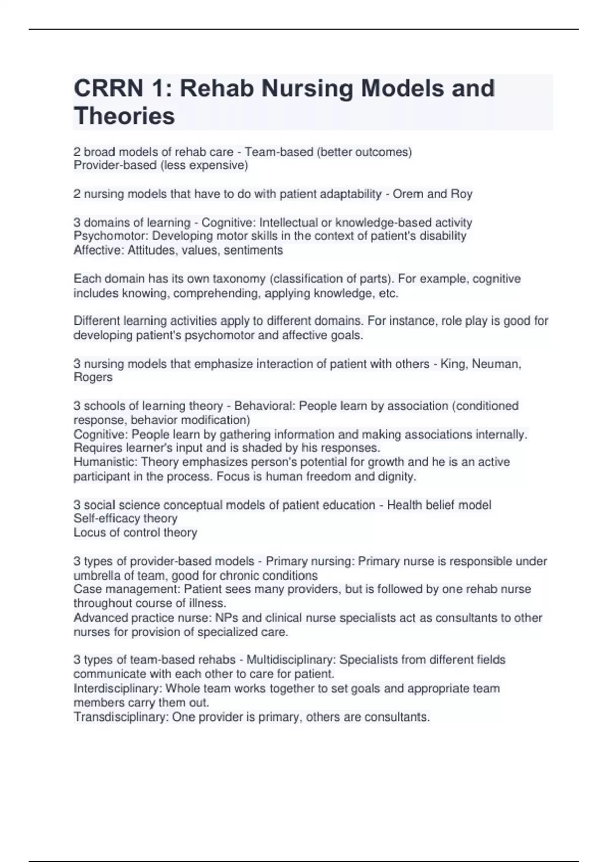 2 broad models of rehab care - Team-based (better outcomes) Provider-based (less expensive) 2 nursing models that have to do with patient adaptability - Orem and Roy 3 domains of learning - Cognitive: Intellectual or knowledge-based activity Psychomotor: Developing motor skills in the context of patient's disability Affective: Attitudes, values, sentiments Each domain has its own taxonomy (classification of parts). For example, cognitive includes knowing, comprehending, applying knowledge, etc. Different learning activities apply to different domains. For instance, role play is good for developing patient's psychomotor and affective goals. 3 nursing models that emphasize interaction of patient with others - King, Neuman, Rogers 3 schools of learning theory - Behavioral: People learn by association (conditioned response, behavior modification) Cognitive: People learn by gathering information and making associations internally. Requires learner's input and is shaded by his responses. Humanistic: Theory emphasizes person's potential for growth and he is an active participant in the process. Focus is human freedom and dignity. 3 social science conceptual models of patient education - Health belief model Self-efficacy theory Locus of control theory 3 types of provider-based models - Primary nursing: Primary nurse is responsible under umbrella of team, good for chronic conditions Case management: Patient sees many providers, but is followed by one rehab nurse throughout course of illness. Advanced practice nurse: NPs and clinical nurse specialists act as consultants to other nurses for provision of specialized care. 3 types of team-based rehabs - Multidisciplinary: Specialists from different fields communicate with each other to care for patient. Interdisciplinary: Whole team works together to set goals and appropriate team members carry them out. Transdisciplinary: One provider is primary, others are consultants