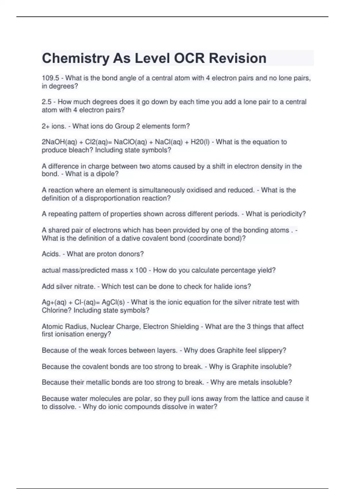 109.5 - What is the bond angle of a central atom with 4 electron pairs and no lone pairs, in degrees? 2.5 - How much degrees does it go down by each time you add a lone pair to a central atom with 4 electron pairs? 2+ ions. - What ions do Group 2 elements form? 2NaOH(aq) + Cl2(aq)= NaClO(aq) + NaCl(aq) + H20(l) - What is the equation to produce bleach? Including state symbols? A difference in charge between two atoms caused by a shift in electron density in the bond. - What is a dipole? A reaction where an element is simultaneously oxidised and reduced. - What is the definition of a disproportionation reaction? A repeating pattern of properties shown across different periods. - What is periodicity? A shared pair of electrons which has been provided by one of the bonding atoms . - What is the definition of a dative covalent bond (coordinate bond)? Acids. - What are proton donors? actual mass/predicted mass x 100 - How do you calculate percentage yield? Add silver nitrate. - Which test can be done to check for halide ions? Ag+(aq) + Cl-(aq)= AgCl(s) - What is the ionic equation for the silver nitrate test with Chlorine? Including state symbols? Atomic Radius, Nuclear Charge, Electron Shielding - What are the 3 things that affect first ionisation energy? Because of the weak forces between layers. - Why does Graphite feel slippery? Because the covalent bonds are too strong to break. - Why is Graphite insoluble? Because their metallic bonds are too strong to break. - Why are metals insoluble? Because water molecules are polar, so they pull ions away from the lattice and cause it to dissolve. - Why do ionic compounds dissolve in water?