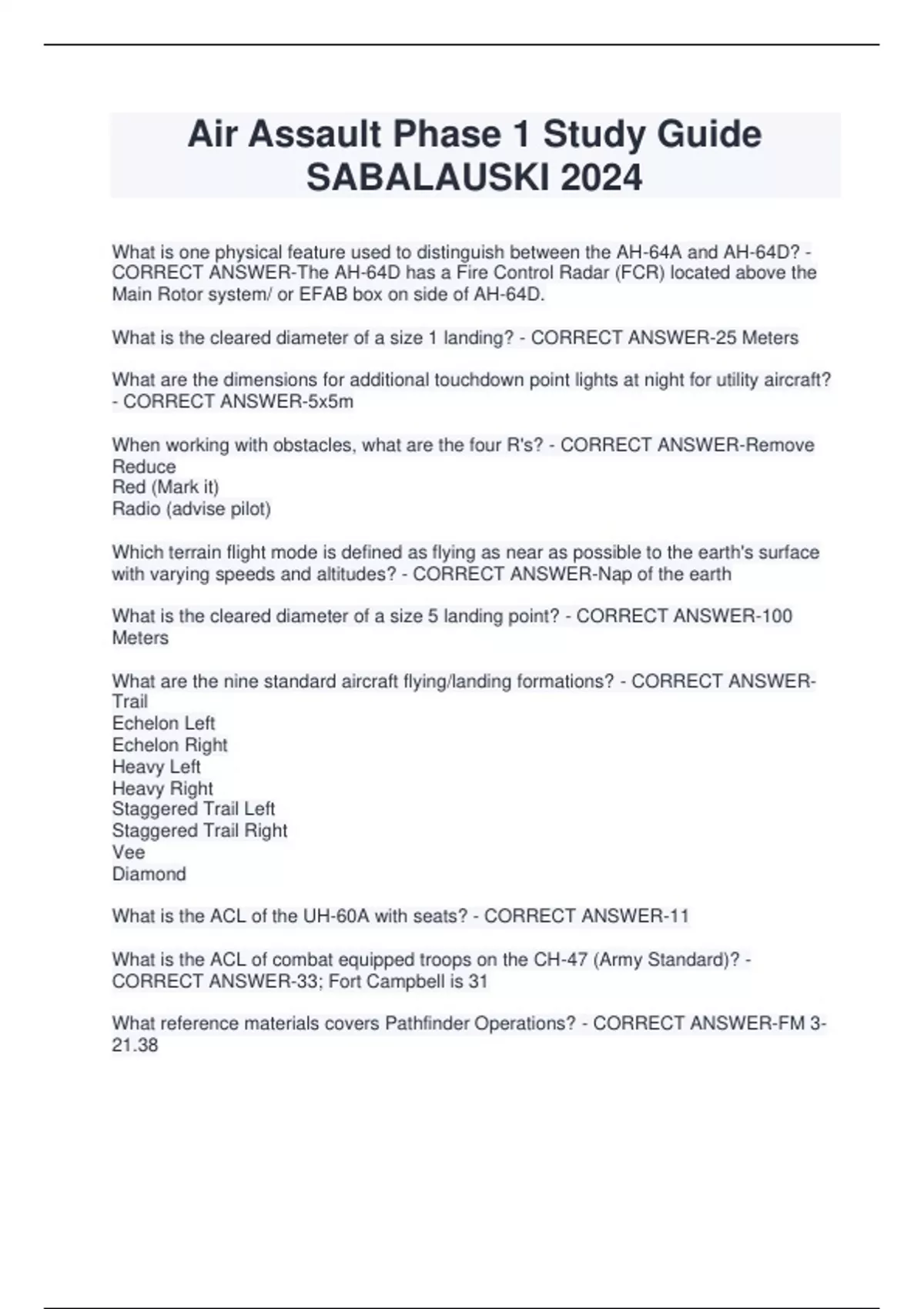 Air Assault Phase 1 Study Guide SABALAUSKI 2024 What is one physical feature used to distinguish between the AH-64A and AH-64D? - CORRECT ANSWER-The AH-64D has a Fire Control Radar (FCR) located above the Main Rotor system/ or EFAB box on side of AH-64D. What is the cleared diameter of a size 1 landing? - CORRECT ANSWER-25 Meters What are the dimensions for additional touchdown point lights at night for utility aircraft? - CORRECT ANSWER-5x5m When working with obstacles, what are the four R's? - CORRECT ANSWER-Remove Reduce Red (Mark it) Radio (advise pilot) Which terrain flight mode is defined as flying as near as possible to the earth's surface with varying speeds and altitudes? - CORRECT ANSWER-Nap of the earth What is the cleared diameter of a size 5 landing point? - CORRECT ANSWER-100 Meters What are the nine standard aircraft flying/landing formations? - CORRECT ANSWERTrail Echelon Left Echelon Right Heavy Left Heavy Right Staggered Trail Left Staggered Trail Right Vee Diamond What is the ACL of the UH-60A with seats? - CORRECT ANSWER-11 What is the ACL of combat equipped troops on the CH-47 (Army Standard)? - CORRECT ANSWER-33; Fort Campbell is 31 What reference materials covers Pathfinder Operations? - CORRECT ANSWER-FM 3- 21.38 There are 3 portions of the aircraft that you must avoid at all times, what are they? - CORRECT ANSWER-1. Main rotor 2. Tail Rotor 3. Cargo hook How many Red Cross markings are on the HH