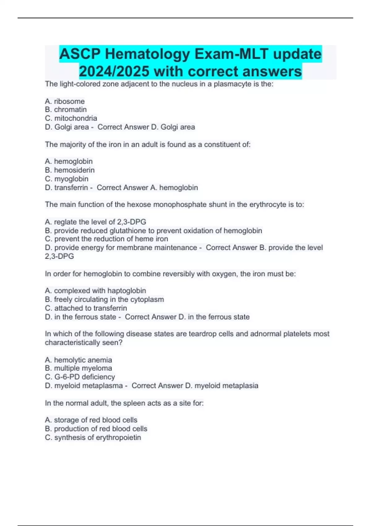 ASCP Hematology Exam-MLT update 2024/2025 with correct answers The light-colored zone adjacent to the nucleus in a plasmacyte is the: A. ribosome B. chromatin C. mitochondria D. Golgi area - Correct Answer D. Golgi area The majority of the iron in an adult is found as a constituent of: A. hemoglobin B. hemosiderin C. myoglobin D. transferrin - Correct Answer A. hemoglobin The main function of the hexose monophosphate shunt in the erythrocyte is to: A. reglate the level of 2,3-DPG B. provide reduced glutathione to prevent oxidation of hemoglobin C. prevent the reduction of heme iron D. provide energy for membrane maintenance - Correct Answer B. provide the level 2,3-DPG In order for hemoglobin to combine reversibly with oxygen, the iron must be: A. complexed with haptoglobin B. freely circulating in the cytoplasm C. attached to transferrin D. in the ferrous state - Correct Answer D. in the ferrous state In which of the following disease states are teardrop cells and adnormal platelets most characteristically seen? A. hemolytic anemia B. multiple myeloma C. G-6-PD deficiency D. myeloid metaplasma - Correct Answer D. myeloid metaplasia In the normal adult, the spleen acts as a site for: