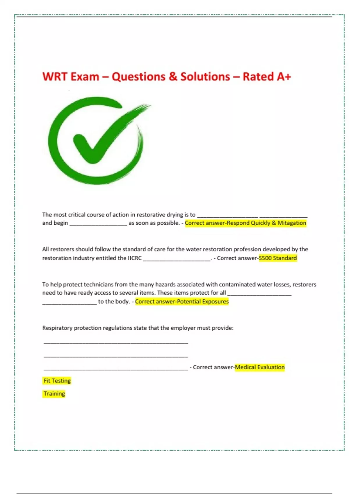 The most critical course of action in restorative drying is to ___________________ _______________ and begin __________________ as soon as possible. - Correct answer-Respond Quickly & Mitagation All restorers should follow the standard of care for the water restoration profession developed by the restoration industry entitled the IICRC _____________________. - Correct answer-S500 Standard To help protect technicians from the many hazards associated with contaminated water losses, restorers need to have ready access to several items. These items protect for all ____________________ _________________ to the body. - Correct answer-Potential Exposures Respiratory protection regulations state that the employer must provide: _____________________________________________ _____________________________________________ _____________________________________________ - Correct answer-Medical Evaluation Fit Testing Training