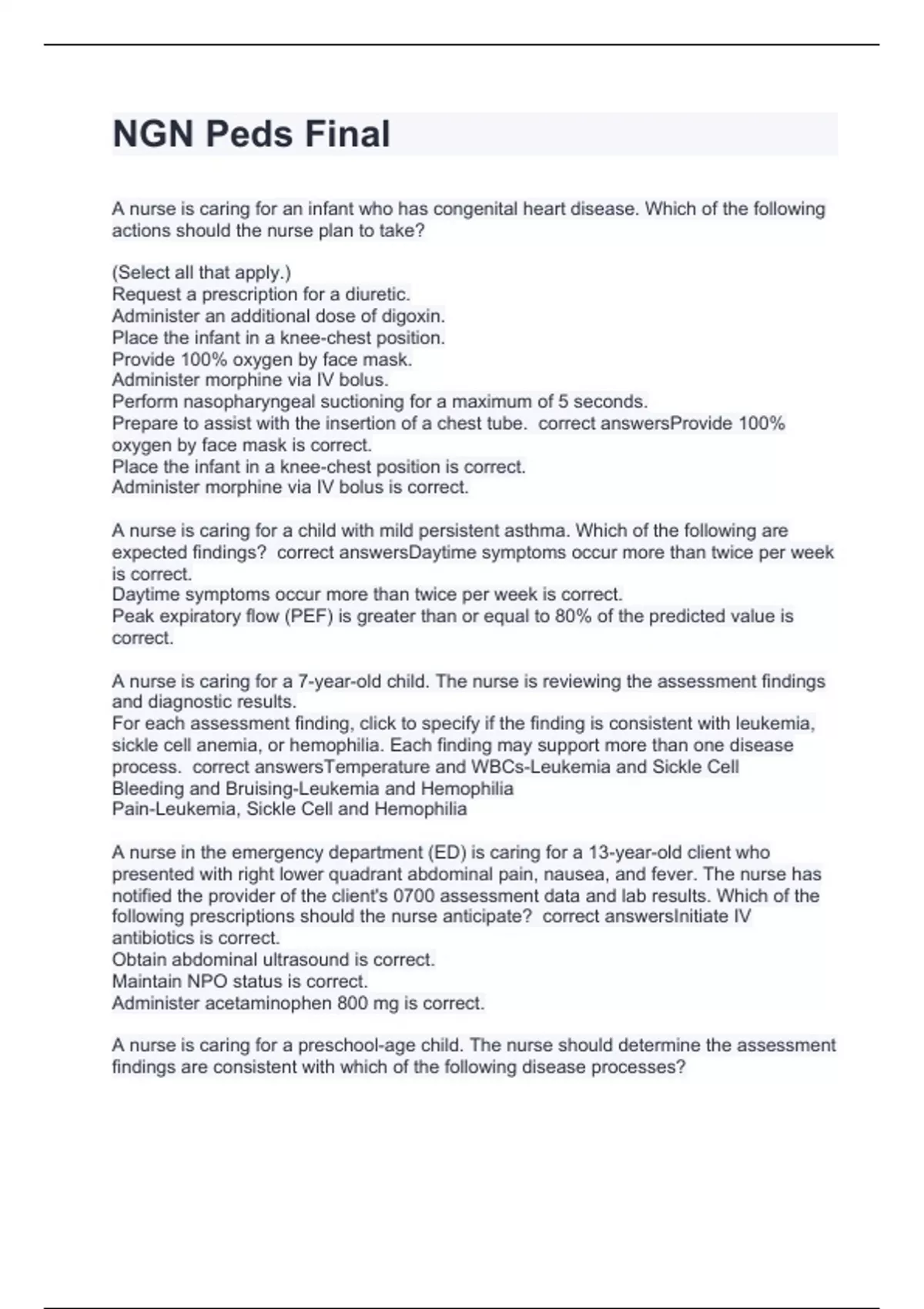A nurse is caring for an infant who has congenital heart disease. Which of the following actions should the nurse plan to take? (Select all that apply.) Request a prescription for a diuretic. Administer an additional dose of digoxin. Place the infant in a knee-chest position. Provide 100% oxygen by face mask. Administer morphine via IV bolus. Perform nasopharyngeal suctioning for a maximum of 5 seconds. Prepare to assist with the insertion of a chest tube. correct answersProvide 100% oxygen by face mask is correct. Place the infant in a knee-chest position is correct. Administer morphine via IV bolus is correct. A nurse is caring for a child with mild persistent asthma. Which of the following are expected findings? correct answersDaytime symptoms occur more than twice per week is correct. Daytime symptoms occur more than twice per week is correct. Peak expiratory flow (PEF) is greater than or equal to 80% of the predicted value is correct. A nurse is caring for a 7-year-old child. The nurse is reviewing the assessment findings and diagnostic results. For each assessment finding, click to specify if the finding is consistent with leukemia, sickle cell anemia, or hemophilia. Each finding may support more than one disease process. correct answersTemperature and WBCs-Leukemia and Sickle Cell Bleeding and Bruising-Leukemia and Hemophilia Pain-Leukemia, Sickle Cell and Hemophilia A nurse in the emergency department (ED) is caring for a 13-year-old client who presented with right lower quadrant abdominal pain, nausea, and fever. The nurse has notified the provider of the client's 0700 assessment data and lab results. Which of the following prescriptions should the nurse anticipate? correct answersInitiate IV antibiotics is correct. Obtain abdominal ultrasound is correct. Maintain NPO status is correct. Administer acetaminophen 800 mg is correct. A nurse is caring for a preschool-age child. The nurse should determine the assessment findings are consistent with which of the following disease processes?
