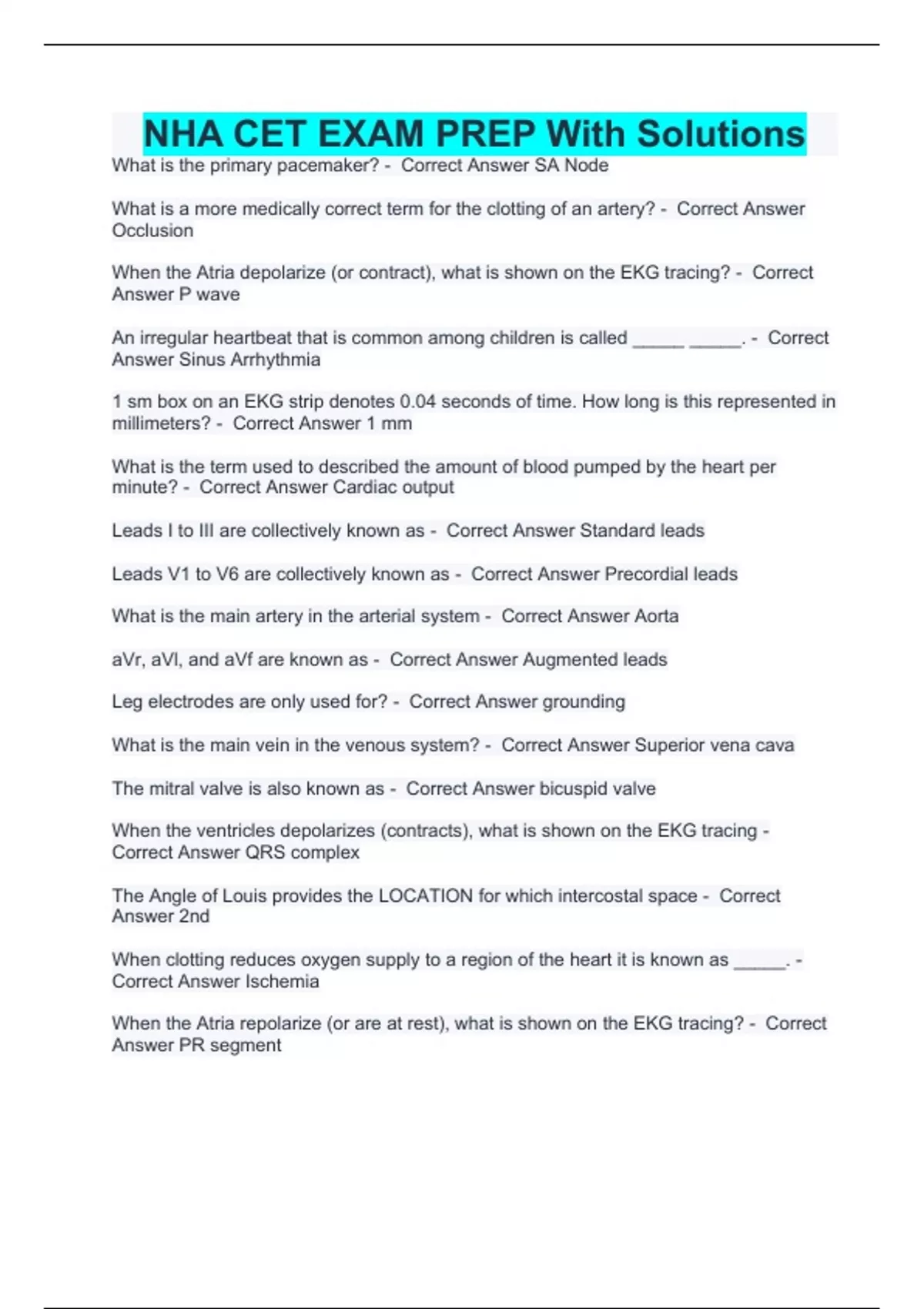 NHA CET EXAM PREP With Solutions What is the primary pacemaker? - Correct Answer SA Node What is a more medically correct term for the clotting of an artery? - Correct Answer Occlusion When the Atria depolarize (or contract), what is shown on the EKG tracing? - Correct Answer P wave An irregular heartbeat that is common among children is called _____ _____. - Correct Answer Sinus Arrhythmia 1 sm box on an EKG strip denotes 0.04 seconds of time. How long is this represented in millimeters? - Correct Answer 1 mm What is the term used to described the amount of blood pumped by the heart per minute? - Correct Answer Cardiac output Leads I to III are collectively known as - Correct Answer Standard leads Leads V1 to V6 are collectively known as - Correct Answer Precordial leads What is the main artery in the arterial system - Correct Answer Aorta aVr, aVl, and aVf are known as - Correct Answer Augmented leads Leg electrodes are only used for? - Correct Answer grounding What is the main vein in the venous system? - Correct Answer Superior vena cava The mitral valve is also known as - Correct Answer bicuspid valve When the ventricles depolarizes (contracts), what is shown on the EKG tracing - Correct Answer QRS complex