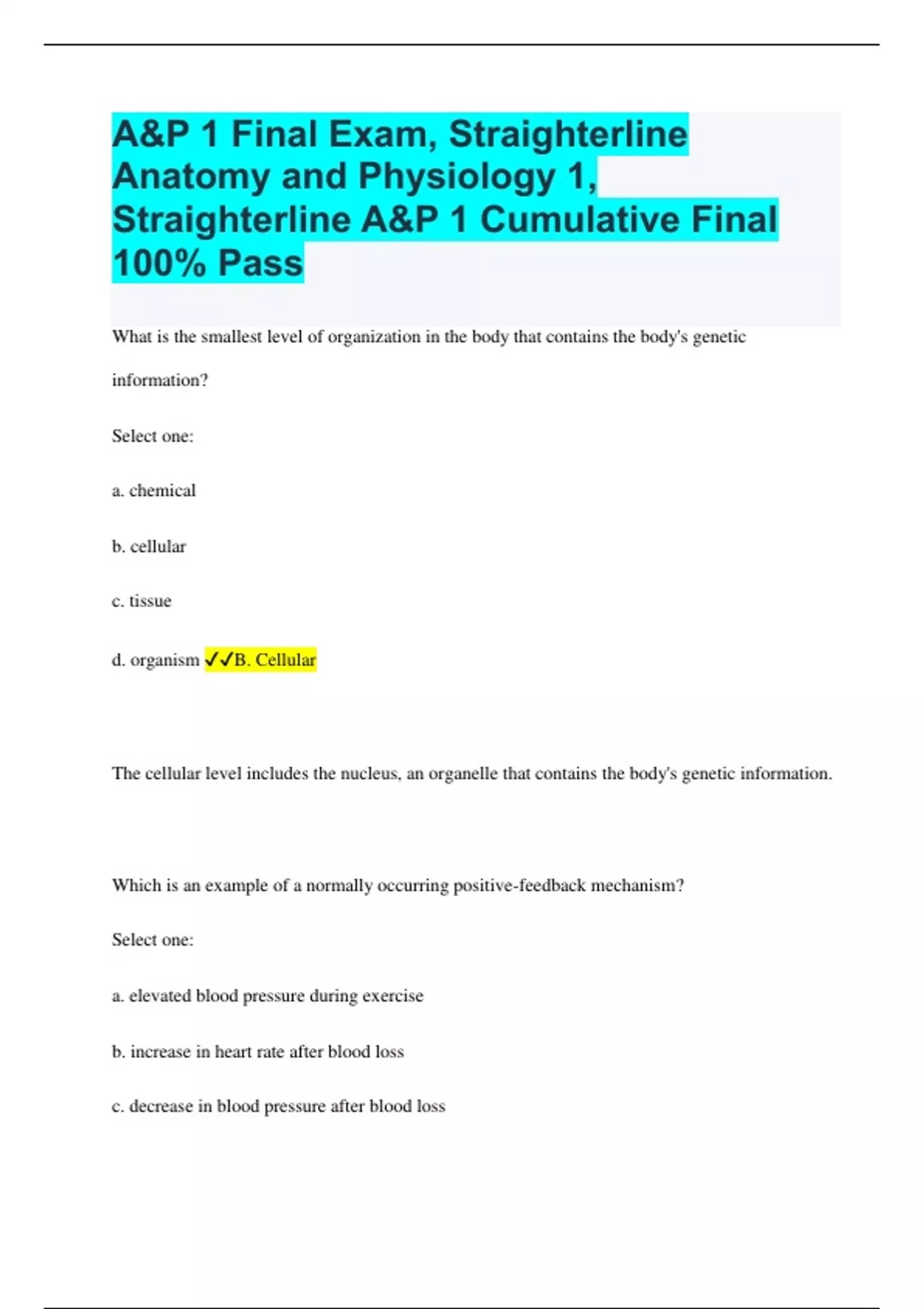 What is the smallest level of organization in the body that contains the body's genetic information? Select one: a. chemical b. cellular c. tissue d. organism B. Cellular The cellular level includes the nucleus, an organelle that contains the body's genetic information. Which is an example of a normally occurring positive-feedback mechanism? Select one: