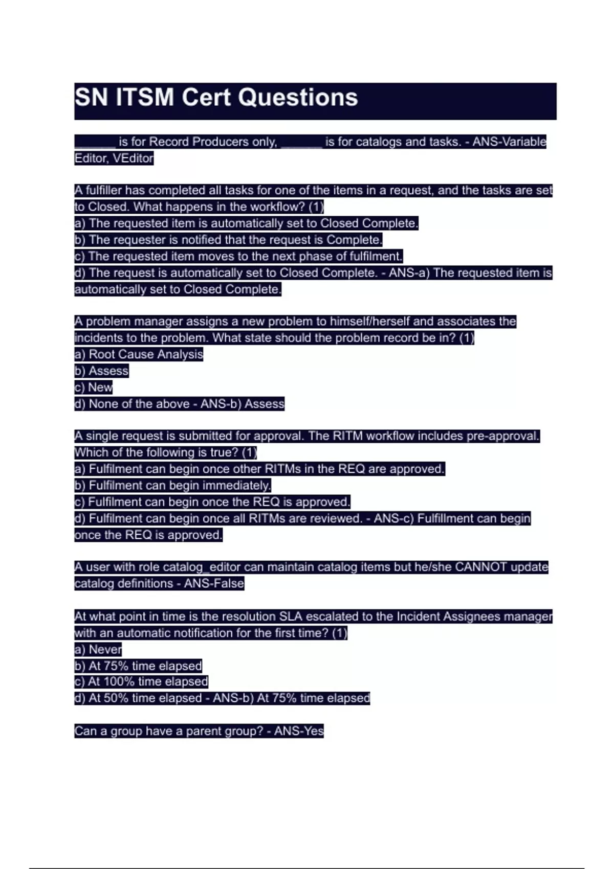 SN ITSM Cert Questions 2024.