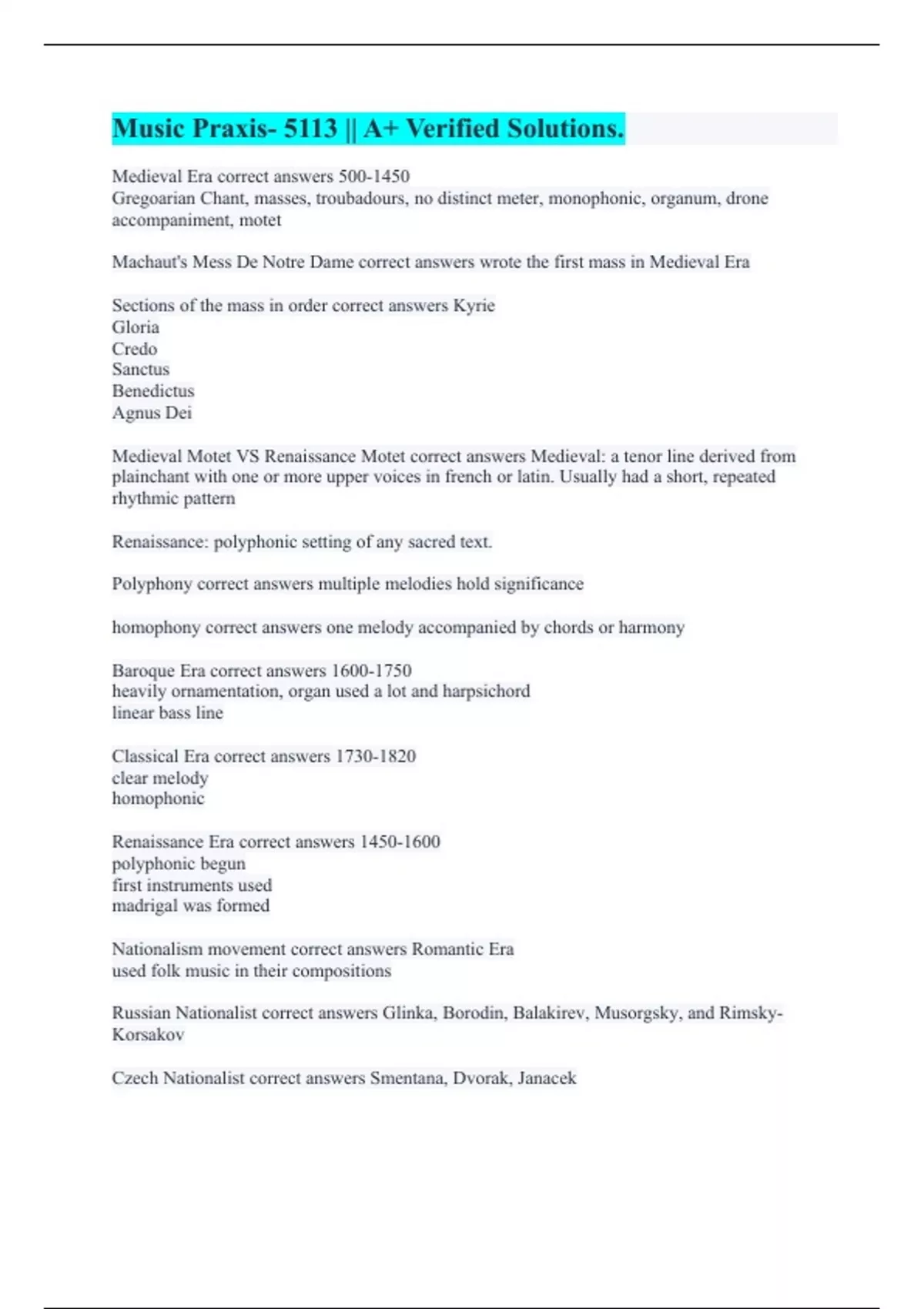 Medieval Era correct answers 500-1450 Gregoarian Chant, masses, troubadours, no distinct meter, monophonic, organum, drone accompaniment, motet Machaut's Mess De Notre Dame correct answers wrote the first mass in Medieval Era Sections of the mass in order correct answers Kyrie Gloria Credo Sanctus Benedictus Agnus Dei Medieval Motet VS Renaissance Motet correct answers Medieval: a tenor line derived from plainchant with one or more upper voices in french or latin. Usually had a short, repeated rhythmic pattern Renaissance: polyphonic setting of any sacred text. Polyphony correct answers multiple melodies hold significance homophony correct answers one melody accompanied by chords or harmony Baroque Era correct answers heavily ornamentation, organ used a lot and harpsichord linear bass line Classical Era correct answers clear melody homophonic Renaissance Era correct answers polyphonic begun first instruments used madrigal was formed Nationalism movement correct answers Romantic Era used folk music in their compositions Russian Nationalist correct answers Glinka, Borodin, Balakirev, Musorgsky, and Rimsky-Korsakov Czech Nationalist correct answers Smentana, Dvorak, Janacek