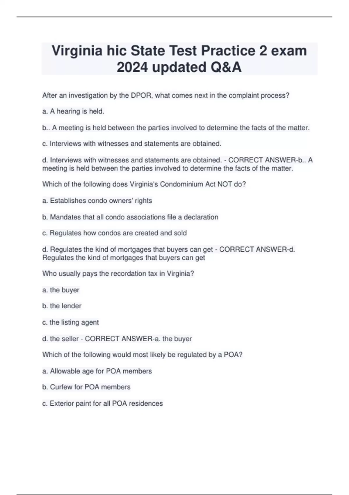 Virginia hic State Test Practice 2 exam 2024 updated Q&A After an investigation by the DPOR, what comes next in the complaint process? a. A hearing is held. b.. A meeting is held between the parties involved to determine the facts of the matter. c. Interviews with witnesses and statements are obtained. d. Interviews with witnesses and statements are obtained. - CORRECT ANSWER-b.. A meeting is held between the parties involved to determine the facts of the matter. Which of the following does Virginia's Condominium Act NOT do? a. Establishes condo owners' rights b. Mandates that all condo associations file a declaration c. Regulates how condos are created and sold d. Regulates the kind of mortgages that buyers can get - CORRECT ANSWER-d. Regulates the kind of mortgages that buyers can get Who usually pays the recordation tax in Virginia? a. the buyer b. the lender c. the listing agent d. the seller - CORRECT ANSWER-a. the buyer Which of the following would most likely be regulated by a POA? a. Allowable age for POA members b. Curfew for POA members c. Exterior paint for all POA residences d. Interior furnishings for all POA residences - CORRECT ANSWER-c. Exterior paint for all POA residences In Virginia, the floodplain consists of the floodway and the ______. a. Flood discharge area b. Flood fringe c. Property within a one mile radius d. Surrounding community - CORRECT ANSWER-b. flood fringe Gerald is selling a property that is not on public water and sewer systems. Per the purchase agreement he has signed with the buyers, he must provide a certificate proving that water from the well is safe, and that the sewage disposal system works. When must the certificate be dated? a. Not more than 15 days prior to settlement b. Not more than 20 days prior to settlement c. Not more than 25 days prior to settlement d. Not more than 30 days prior to settlement - CORRECT ANSWER-d. Not more than 30 days prior to settlement In Virginia, how long must completed real estate forms be kept on file with the broker? a. A minimum of three years b. At least six months c. One yea
