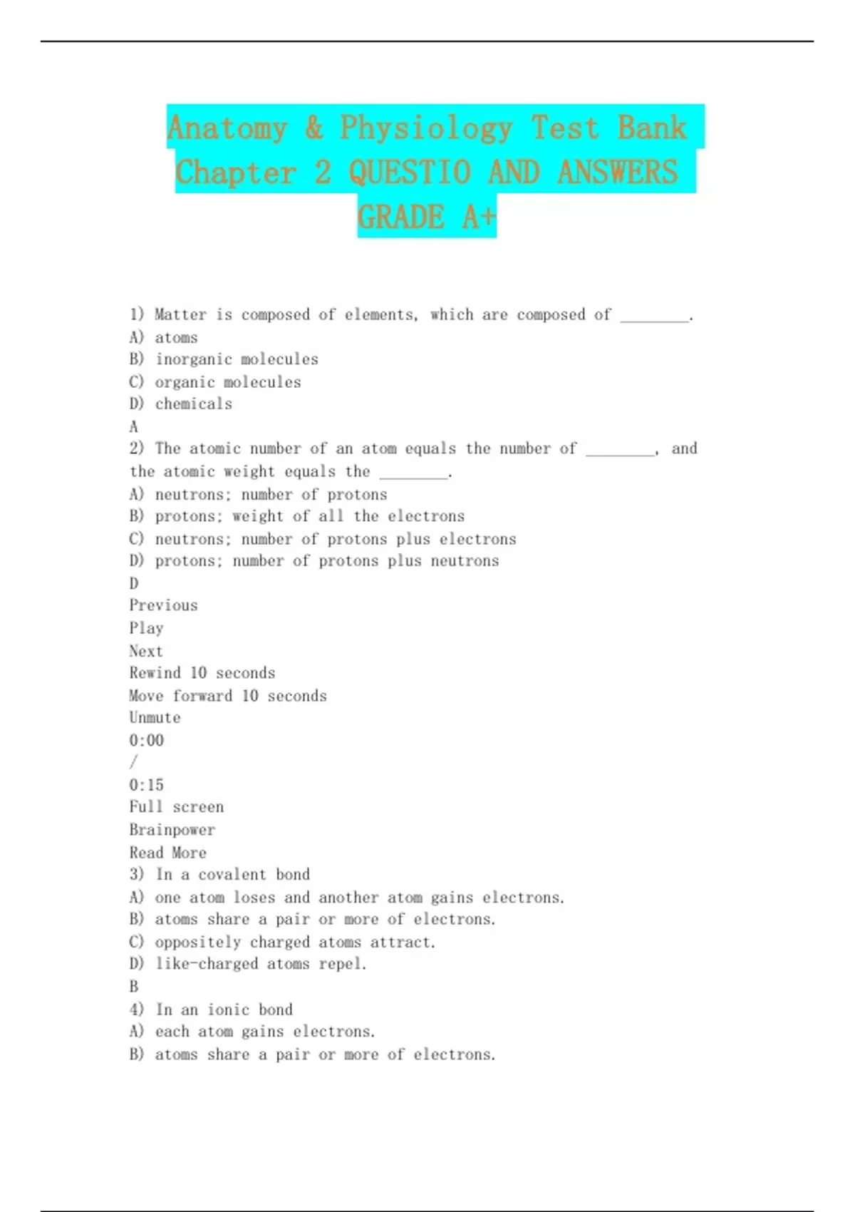 Anatomy & Physiology Test Bank Chapter 2 QUESTIO AND ANSWERS GRADE A+