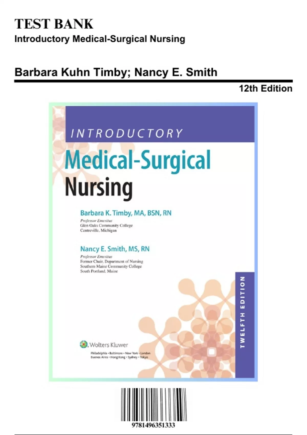 Test Bank for Introductory Medical-Surgical Nursing, 12th Edition by Timby Smith, 9781496351333, Covering Chapters 1-72 | Includes Rationales