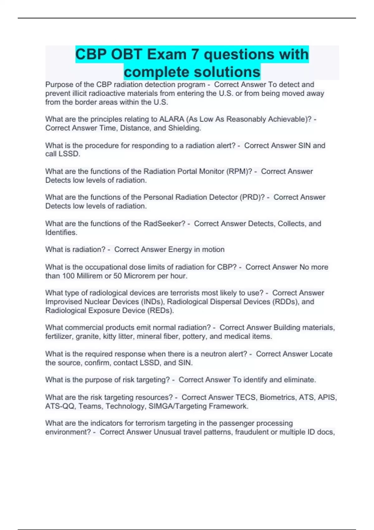 CBP OBT Exam 7 questions with complete solutions Purpose of the CBP radiation detection program - Correct Answer To detect and prevent illicit radioactive materials from entering the U.S. or from being moved away from the border areas within the U.S. What are the principles relating to ALARA (As Low As Reasonably Achievable)? - Correct Answer Time, Distance, and Shielding. What is the procedure for responding to a radiation alert? - Correct Answer SIN and call LSSD. What are the functions of the Radiation Portal Monitor (RPM)? - Correct Answer Detects low levels of radiation. What are the functions of the Personal Radiation Detector (PRD)? - Correct Answer Detects low levels of radiation. What are the functions of the RadSeeker? - Correct Answer Detects, Collects, and Identifies. What is radiation? - Correct Answer Energy in motion What is the occupational dose limits of radiation for CBP? - Correct Answer No more than 100 Millirem or 50 Microrem per hour. What type of radiological devices are terrorists most likely to use? - Correct Answer Improvised Nuclear Devices (INDs), Radiological Dispersal Devices (RDDs), and Radiological Exposure Device (REDs). What commercial products emit normal radiation? - Correct Answer Building materials, fertilizer, granite, kitty litter, mineral fiber, pottery, and medical items. What is the required response when there is a neutron alert? - Correct Answer Locate the source, confirm, contact LSSD, and SIN. What is the purpose of risk targeting? - Correct Answer To identify and eliminate. What are the risk targeting resources? - Correct Answer TECS, Biometrics, ATS, APIS, ATS-QQ, Teams, Technology, SIMGA/Targeting Framework. What are the indicators for terrorism targeting in the passenger processing environment? - Correct Answer Un