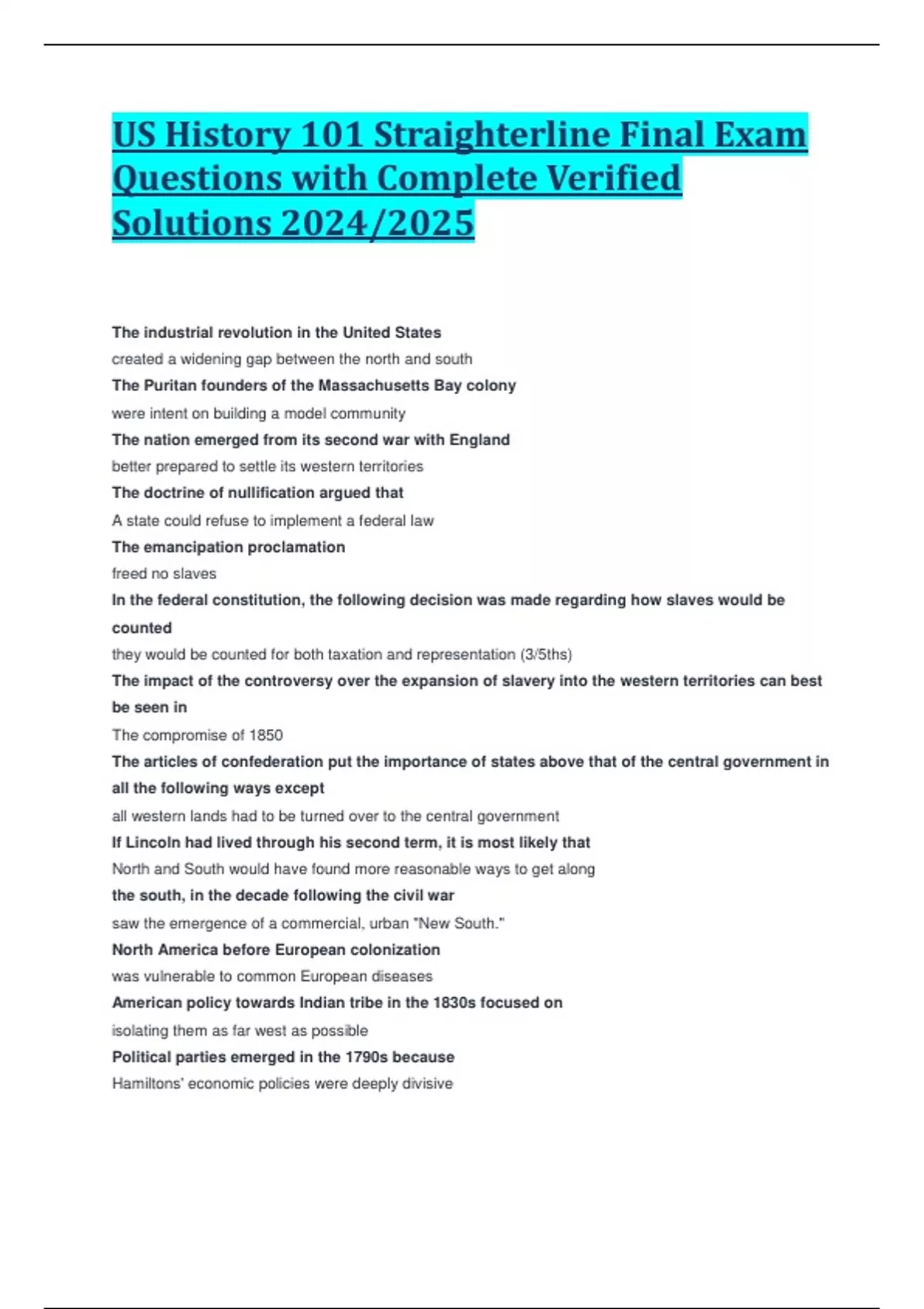 US History 101 Straighterline Final Exam Questions with Complete Verified Solutions 2024/2025