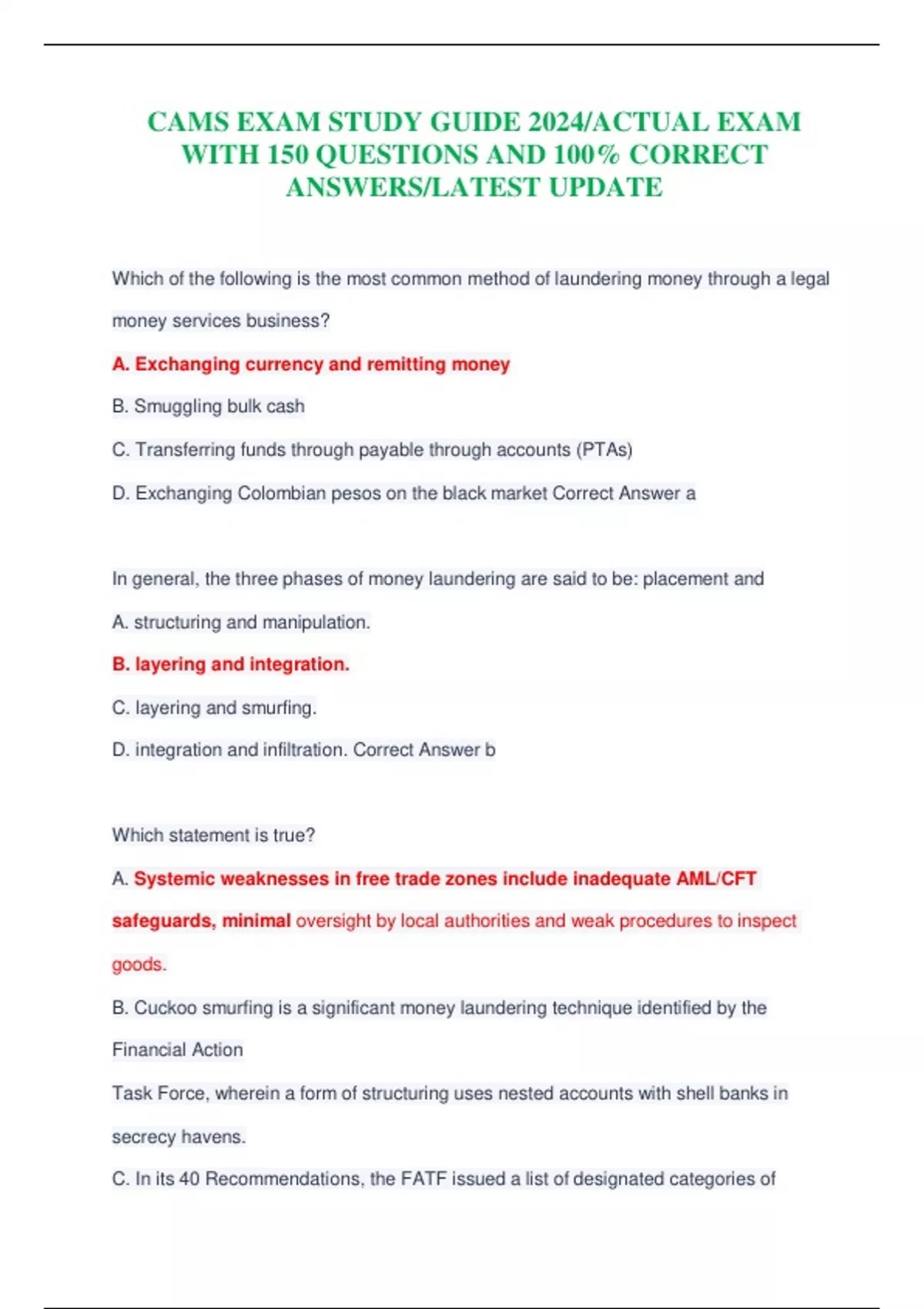 CAMS EXAM STUDY GUIDE 2024/ACTUAL EXAM WITH 150 QUESTIONS AND 100% CORRECT ANSWERS/LATEST UPDATE