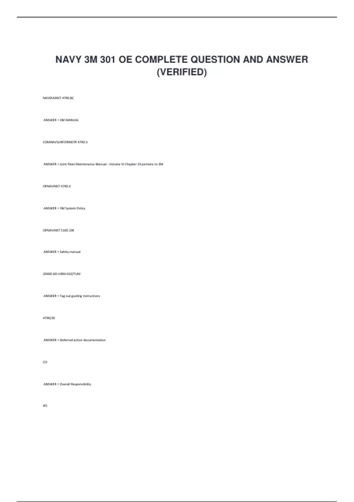 NAVY 3M 301 OE COMPLETE QUESTION AND ANSWER (VERIFIED) NAVSEAINST 4790.8C ANSWER = 3M MANUAL COMNAVSURFORINSTR 4790.3 ANSWER = Joint Fleet Maintenance Manual - Volume V I Chapter 19 pertains to 3M OPNAVINST 4790.4 ANSWER = 3M System Policy OPNAVINST 5100.19E ANSWER = Safety manual 20400 -AD-URM -010/TUM ANSWER = Tag out guiding instructions 4790/2K ANSWER = Deferred action documentation CO ANSWER = Overall Responsibility XO