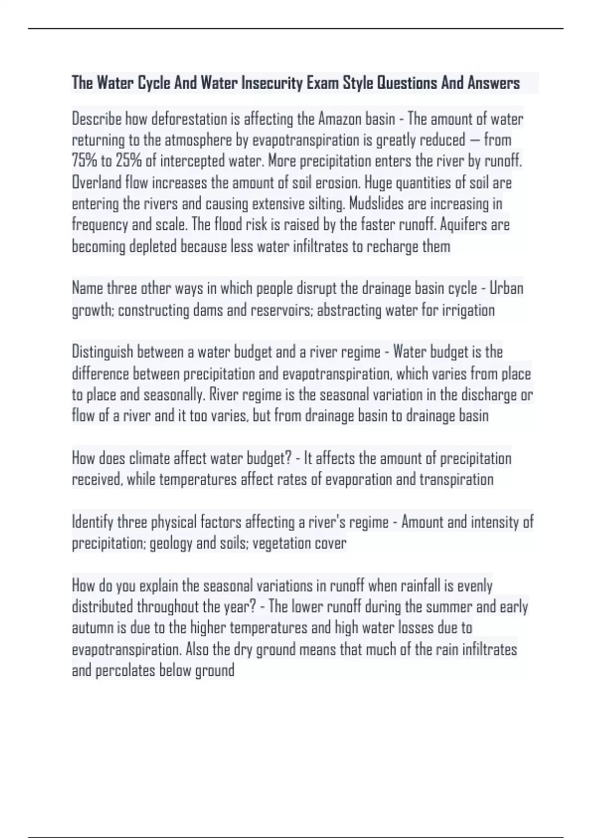 The Water Cycle And Water Insecurity Exam Style Questions And Answers Describe how deforestation is affecting the Amazon basin - The amount of water returning to the atmosphere by evapotranspiration is greatly reduced — from 75% to 25% of intercepted water. More precipitation enters the river by runoff. Overland flow increases the amount of soil erosion. Huge quantities of soil are entering the rivers and causing extensive silting. Mudslides are increasing in frequency and scale. The flood risk is raised by the faster runoff. Aquifers are becoming depleted because less water infiltrates to recharge them Name three other ways in which people disrupt the drainage basin cycle - Urban growth; constructing dams and reservoirs; abstracting water for irrigation Distinguish between a water budget and a river regime - Water budget is the difference between precipitation and evapotranspiration, which varies from place to place and seasonally. River regime is the seasonal variation in the discharge or flow of a river and it too varies, but from drainage basin to drainage basin How does climate affect water budget? - It affects the amount of precipitation received, while temperatures affect rates of evaporation and transpiration Identify three physical factors affecting a river's regime - Amount and intensity of precipitation; geology and soils; vegetation cover How do you explain the seasonal variations in runoff when rainfall is evenly distributed throughout the year? - The lower runoff during the summer and early autumn is due to the higher temperatures and high water losses due to evapotranspiration. Also the dry ground means that much of the rain infiltrates and percolates below ground What is a storm hydrograph? - A storm hydrograph shows the response of a river's discharge following a period of rainfall. A critical aspect of the hydrograph is the lag time between the rainfall peak and the river's peak discharge How does geology affect the shape of a storm hydrograph? - If the geology is hard and impervious, then the speed of runoff will be such as to result in a relatively short lag time. If the geology is soft and porous, then runoff will be less and the water will reach the river more slowly as it takes place below ground. The lag time will be relatively long Why does urbanisation increase the risk of flooding? - The large areas of concrete and tarmac mean that most falling rain becomes surface runoff which moves quickly to the nearest stream or river. Underground drains and sewers also move water quickly to drainage channels. Because of this swift transfer of water, rivers quickly reach the bank-full stage and water begins to overspill their channels as floods What is meant by a store and a flow? - A store is where water is held for varying amounts of 'residence' time. A flow is the movement of water between stores Identify the three largest stores in size order - 1. The oceans 2. Icecaps and glaciers 3. Groundwater Which two water stores are non-renewable, and why? - 1. Fossil water: old, deep groundwater from former wetter periods 2. Losses from the cryosphere: melting of ice as a result of global warming Distinguish between blue and green water - Blue water is stored in rivers, lakes and groundwater in liquid form — a visible part of the hydrological cycle. Green water is water stored in the soil and vegetation — an invisible part of the hydrological cycle Why is the hydrological cycle a closed system? - There are no external inputs and outputs. It is a self-contained entity. Some might argue solar energy, which drives the cycle, is an input What is the water budget, and why does it vary from place to place? - The water budget of a place is the difference between the amount of water gained from precipitation and the amount lost as a result of evapotranspiration. The budget is in surplus when precipitation exceeds evapotranspiration. It is in deficit when the situation is reversed. It varies from place to place because climate (precipitation and temperature) does What are the main inputs of a drainage basin system? - Precipitation. Also possibly water from a tributary basin What are the main outputs of a drainage basin system? - Evaporation, transpiration and river discharge How does relief affect the inputs and outputs of a drainage basin? - Altitude will affect the precipitation input (orographic rain or snow). The steepness of slopes will affect the rate of runoff — the steeper the slope, the faster the rate Distinguish between interception and infiltration - Interception is the process by which water is stored in the vegetation. Infiltration is the process by which water soaks into, or is absorbed by the soil How does geology affect the flows in a drainage basin? - Geology affects the balance of the flows by which precipitation reaches a river. Where the geology is hard and impermeable (e.g. granite), there will be much surface runoff and relatively little infiltration and percolation. Where rock is porous, then the balance will be the reverse with little runoff and much percolation and water reaching the river via through flow and groundwater flow Describe three different ways of conserving water - More efficient use of irrigation water; greater use of grey water; filtration technology; water metering