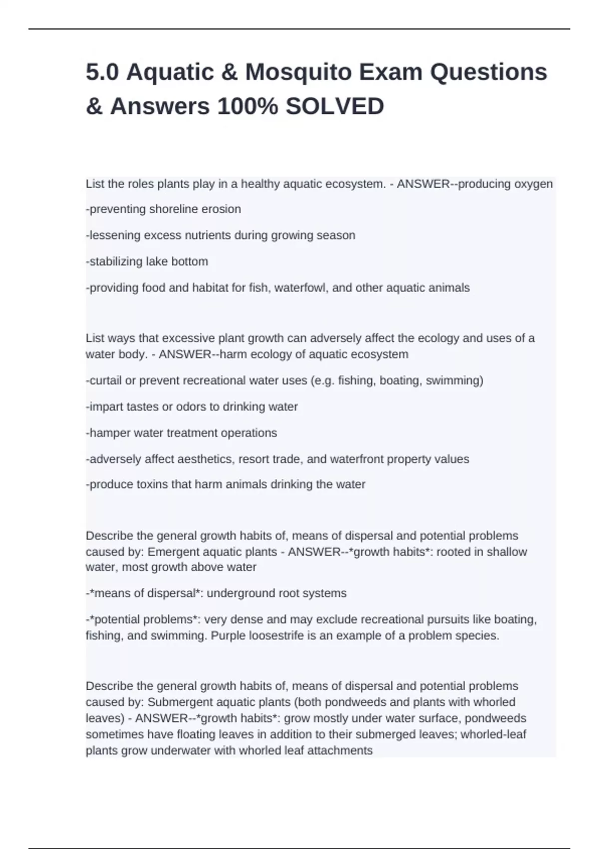 Describe the general growth habits of, means of dispersal and potential problems caused by: Submergent aquatic plants (both pondweeds and plants with whorled leaves) - ANSWER--*growth habits*: grow mostly under water surface, pondweeds sometimes have floating leaves in addition to their submerged leaves; whorled-leaf plants grow underwater with whorled leaf attachments -*means of dispersal*: pondweeds have extensive root systems, runners, and can also reproduce from seeds; plants with whorled leaves can disperse when uprooted by breaking free and getting moved by the wind