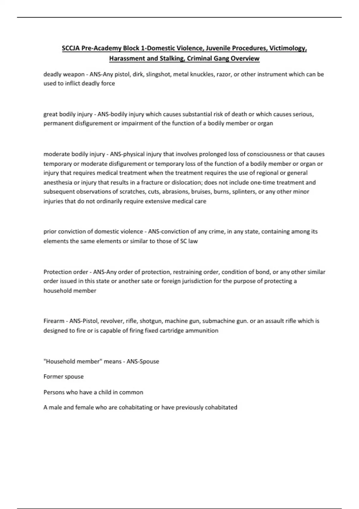 SCCJA Pre-Academy Block 1-Domestic Violence, Juvenile Procedures, Victimology, Harassment and Stalking, Criminal Gang Overview deadly weapon - ANS-Any pistol, dirk, slingshot, metal knuckles, razor, or other instrument which can be used to inflict deadly force great bodily injury - ANS-bodily injury which causes substantial risk of death or which causes serious, permanent disfigurement or impairment of the function of a bodily member or organ moderate bodily injury - ANS-physical injury that involves prolonged loss of consciousness or that causes temporary or moderate disfigurement or temporary loss of the function of a bodily member or organ or injury that requires medical treatment when the treatment requires the use of regional or general anesthesia or injury that results in a fracture or dislocation; does not include one-time treatment and subsequent observations of scratches, cuts, abrasions, bruises, burns, splinters, or any other minor injuries that do not ordinarily require extensive medical care prior conviction of domestic violence - ANS-conviction of any crime, in any state, containing among its elements the same elements or similar to those of SC law Protection order - ANS-Any order of protection, restraining order, condition of bond, or any other similar order issued in this state or another sate or foreign jurisdiction for the purpose of protecting a household member Firearm - ANS-Pistol, revolver, rifle, shotgun, machine gun, submachine gun. or an assault rifle which is designed to fire or is capable of firing fixed cartridge ammunition "Household member" means - ANS-Spouse Former spouse Persons who have a child in common A male and female who are cohabitating or have previously cohabitated Obergefell v. Hodges - ANS-States obligated to recognize same-sex marriage from other states. Domestic violence third degree - ANS--To cause, offer, or attempt physical harm -with apparent present ability -directed at a household member -creating fear of imminent peril Domestic violence second degree - ANS--To cause, offer, or attempt physical harm -with apparent present ability -directed at a household member -creating fear of imminent peril AND -Moderate bodily injury results -the offender violates a protection order -the offender has a prior conviction for DV in the past 10 years OR -In the process of committing DV third: ~the offense is committed in the presence of or perceived by a minor ~the victim is pregnant and the offender knew or should have known ~the DV is committed during the commission of a robbery, burglary, kidnapping, or theft ~the victim's breathing or air flow is impeded ~the offender physically restricts the victim from reporting to or calling emergency services