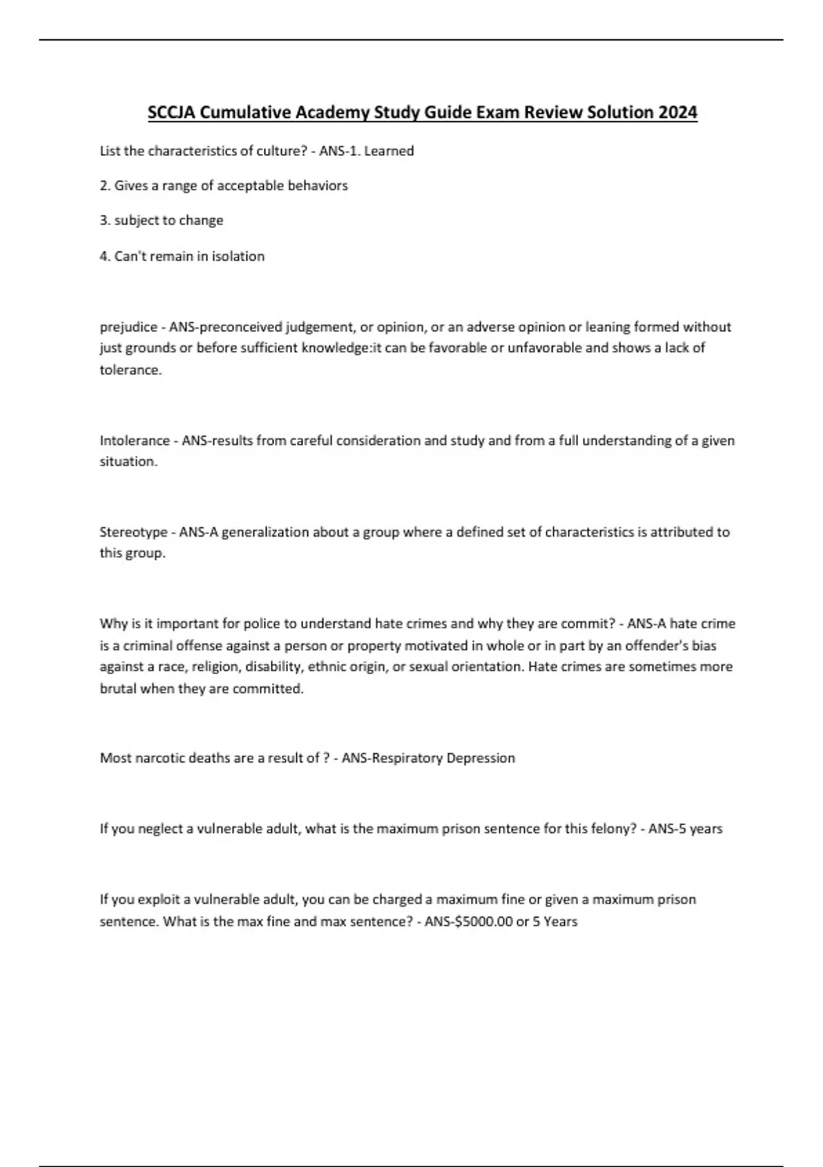 SCCJA Cumulative Academy Study Guide Exam Review Solution 2024 List the characteristics of culture? - ANS-1. Learned 2. Gives a range of acceptable behaviors 3. subject to change 4. Can't remain in isolation prejudice - ANS-preconceived judgement, or opinion, or an adverse opinion or leaning formed without just grounds or before sufficient knowledge:it can be favorable or unfavorable and shows a lack of tolerance. Intolerance - ANS-results from careful consideration and study and from a full understanding of a given situation. Stereotype - ANS-A generalization about a group where a defined set of characteristics is attributed to this group. Why is it important for police to understand hate crimes and why they are commit? - ANS-A hate crime is a criminal offense against a person or property motivated in whole or in part by an offender's bias against a race, religion, disability, ethnic origin, or sexual orientation. Hate crimes are sometimes more brutal when they are committed. Most narcotic deaths are a result of ? - ANS-Respiratory Depression If you neglect a vulnerable adult, what is the maximum prison sentence for this felony? - ANS-5 years If you exploit a vulnerable adult, you can be charged a maximum fine or given a maximum prison sentence. What is the max fine and max sentence? - ANS...