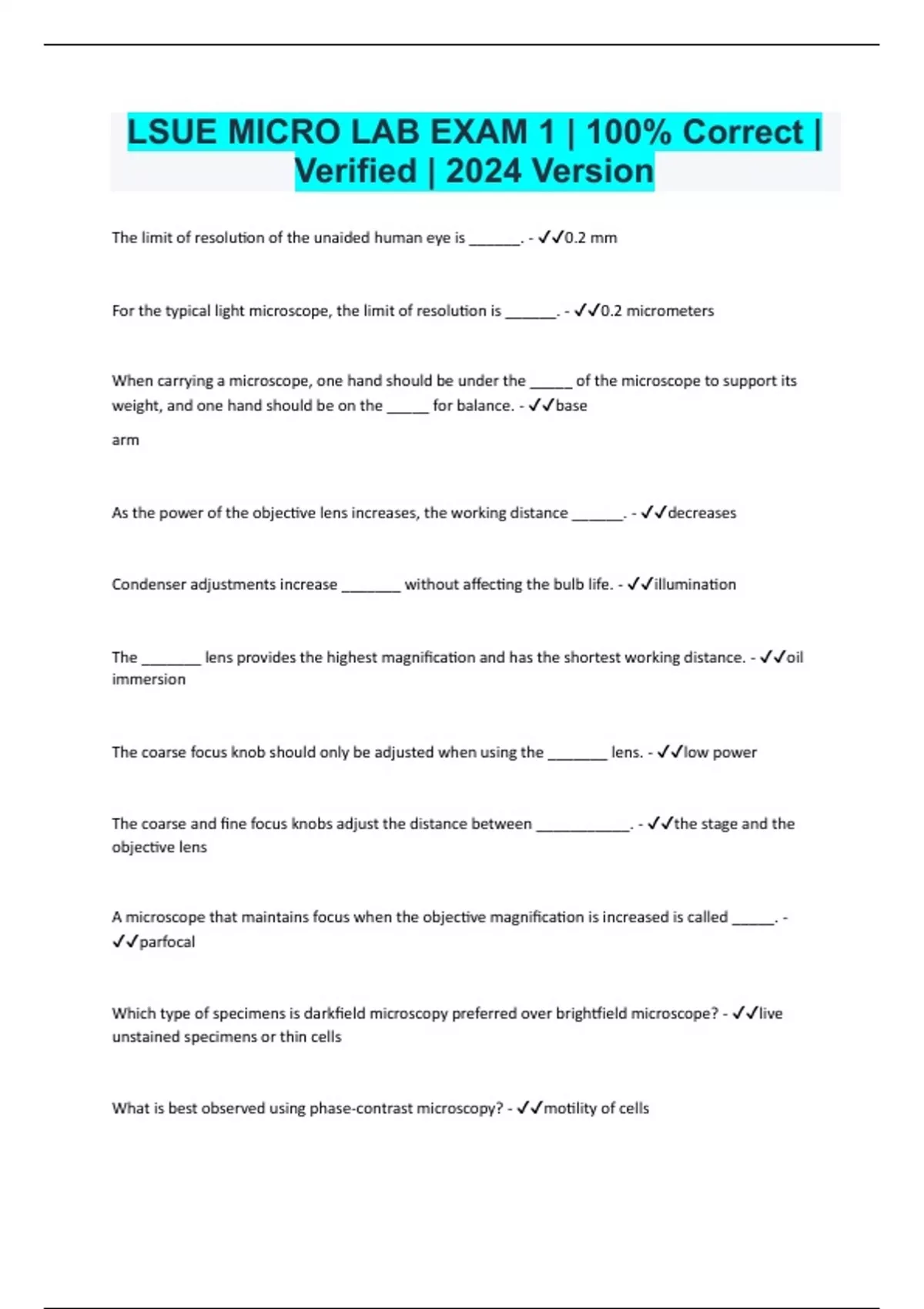 LSUE MICRO LAB EXAM 1 | 100% Correct | Verified | 2024 Version The limit of resolution of the unaided human eye is ______. - 0.2 mm For the typical light microscope, the limit of resolution is ______. - 0.2 micrometers When carrying a microscope, one hand should be under the _____ of the microscope to support its weight, and one hand should be on the _____ for balance. - base arm As the power of the objective lens increases, the working distance ______. - decreases Condenser adjustments increase _______ without affecting the bulb life. - illumination The _______ lens provides the highest magnification and has the shortest working distance. - oil immersion The coarse focus knob should only be adjusted when using the _______ lens. - low power The coarse and fine focus knobs adjust the distance between ___________. - the stage and the objective lens A microscope that maintains focus when the objective magnification is increased is called _____. - parfocal Which type of specimens is darkfield microscopy preferred over brightfield microscope? - live unstained specimens or thin cells What is best observed using phase-contrast microscopy? - motility of cells What organisms were formerly known as "blue-green algae"? - cyanobacteria Fungi contain _____ in their cell walls whereas plants contain _______. - chitin cellulose refers to fungi that grow as yeast forms in tissue and reproduce by budding, but produce mycelium and sporulation structures when grown in nutrient medium - dimorphic kills the microorganisms, coagulates the protoplasm of the cells, and causes them to adhere to the cell - heat fixation ovoid cells that occur in pair and chains - streptococci cocci that occur in grapelike clusters - staphylococci rods that can occur singly or in chains - bacillus color-bearing groups of stains - chromophores Acidic dyes are _____ charged. - negatively ______ is a basic stain which has a positive charge. - crystal violet Volutin is composed of what? - polyphosphate ovoid cells that have characteristic buds and are much larger than bacteria - yeasts