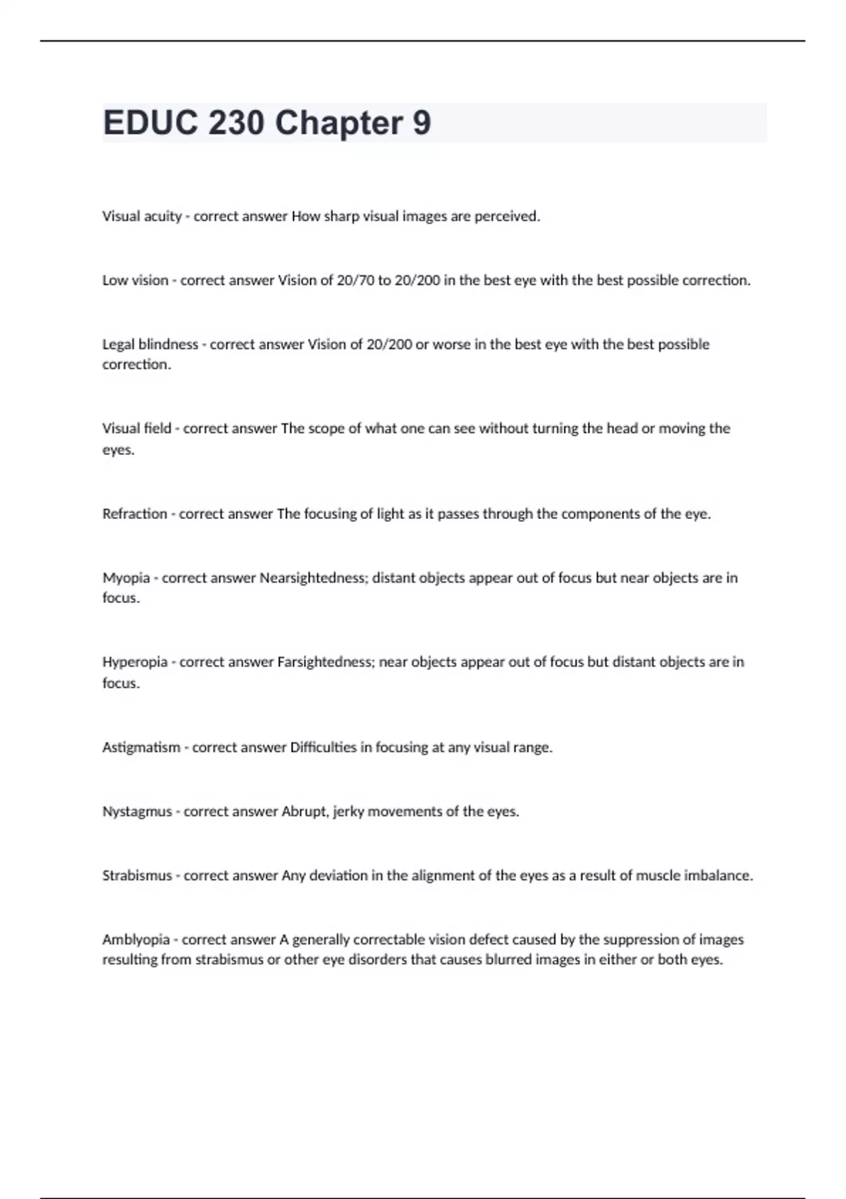 EDUC 230 Chapter 9Visual acuity - correct answer How sharp visual images are perceived. Low vision - correct answer Vision of 20/70 to 20/200 in the best eye with the best possible correction. Legal blindness - correct answer Vision of 20/200 or worse in the best eye with the best possible correction. Visual field - correct answer The scope of what one can see without turning the head or moving the eyes. Refraction - correct answer The focusing of light as it passes through the components of the eye. Myopia - correct answer Nearsightedness; distant objects appear out of focus but near objects are in focus. Hyperopia - correct answer Farsightedness; near objects appear out of focus but distant objects are in focus. Astigmatism - correct answer Difficulties in focusing at any visual range. Nystagmus - correct answer Abrupt, jerky movements of the eyes. Strabismus - correct answer Any deviation in the alignment of the eyes as a result of muscle imbalance. Amblyopia - correct answer A generally correctable vision defect caused by the suppression of images resulting from strabismus or other eye disorders that causes blurred images in either or both eyes.