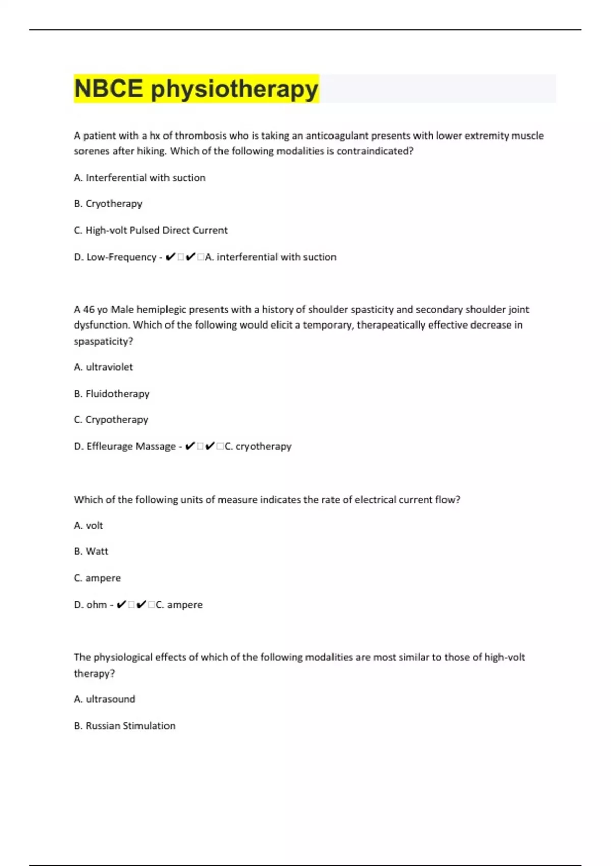 A patient with a hx of thrombosis who is taking an anticoagulant presents with lower extremity muscle sorenes after hiking. Which of the following modalities is contraindicated? A. Interferential with suction B. Cryotherapy C. High-volt Pulsed Direct Current D. Low-Frequency - ️️A. interferential with suction A 46 yo Male hemiplegic presents with a history of shoulder spasticity and secondary shoulder joint dysfunction. Which of the following would elicit a temporary, therapeatically effective decrease in spaspaticity? A. ultraviolet B. Fluidotherapy C. Crypotherapy D. Effleurage Massage - ️️C. cryotherapy Which of the following units of measure indicates the rate of electrical current flow? A. volt B. Watt C. ampere D. ohm - ️️C. ampere The physiological effects of which of the following modalities are most similar to those of high-volt therapy? A. ultrasound B. Russian Stimulation C. Faradic Current D. shortwave diathermy - ️️C. faradic current