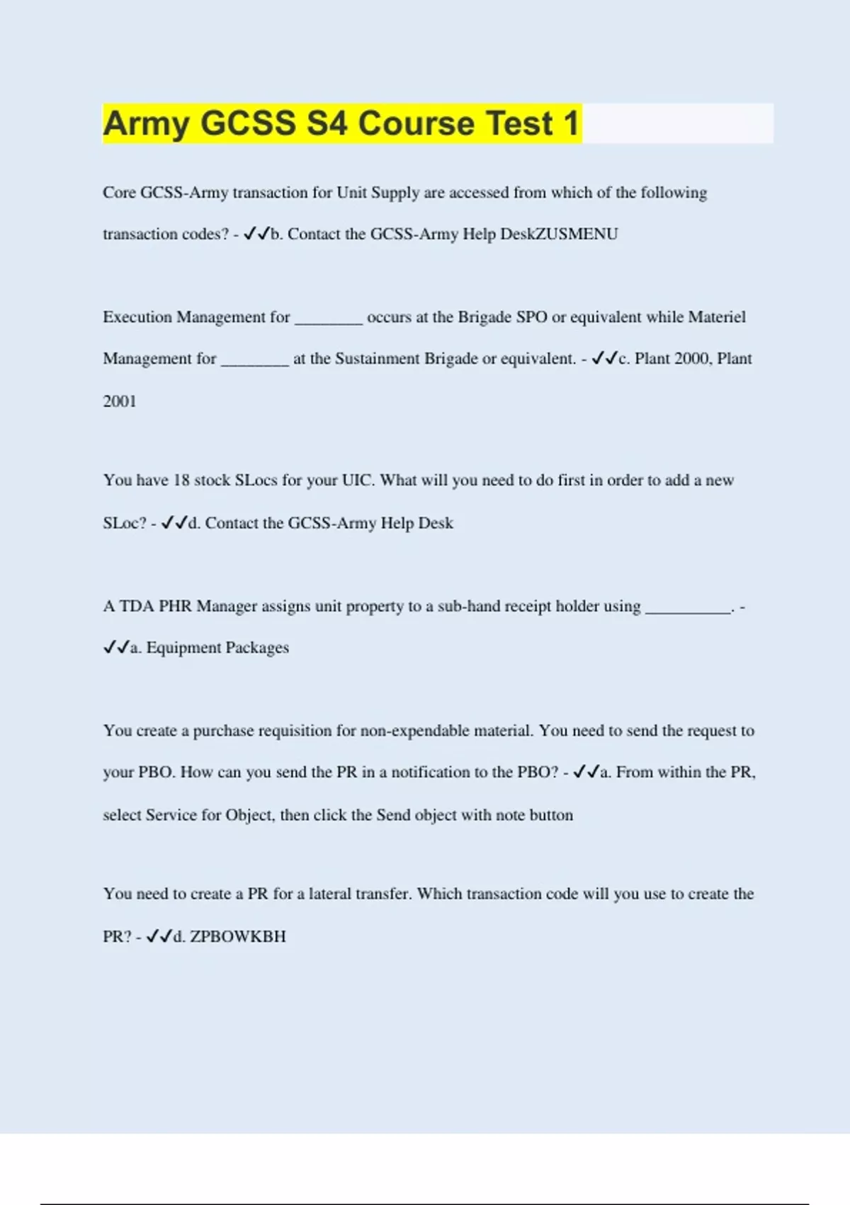 Army GCSS S4 Course Test 1 Core GCSS-Army transaction for Unit Supply are accessed from which of the following transaction codes? - b. Contact the GCSS-Army Help DeskZUSMENU Execution Management for ________ occurs at the Brigade SPO or equivalent while Materiel Management for ________ at the Sustainment Brigade or equivalent. - c. Plant 2000, Plant 2001 You have 18 stock SLocs for your UIC. What will you need to do first in order to add a new SLoc? - d. Contact the GCSS-Army Help Desk A TDA PHR Manager assigns unit property to a sub-hand receipt holder using __________. - a. Equipment Packages You create a purchase requisition for non-expendable material. You need to send the request to your PBO. How can you send the PR in a notification to the PBO? - a. From within the PR, select Service for Object, then click the Send object with note button You need to create a PR for a lateral transfer. Which transaction code will you use to create the PR? - d. ZPBOWKBH If you have 16 SLocs in your unit and the cyclic inventory has a material which you have issued to 8 different SHRs, that particular material will appear on a minimum of ________ inventory count sheets. - c. 8 You create a request for a Material Master for a non-standard non-expendable item in order to account for and manage the item within GCSS-Army. When is the Material Master created enabling the item to be requested, received, and issued?General supplies are ordered by unit supply personnel using a Manual Reservation. After approval by release strategy managers, the next MRP run will convert the purchasing document to a Stock Transport Order (STO), a ________ series document number sent to the SSA for fulfillment - b. After the PBO provides approval General supplies are ordered by unit supply personnel using a Manual Reservation. After approval by release strategy managers, the next MRP run will convert the purchasing document to a Stock Transport Order (STO), a ________ series