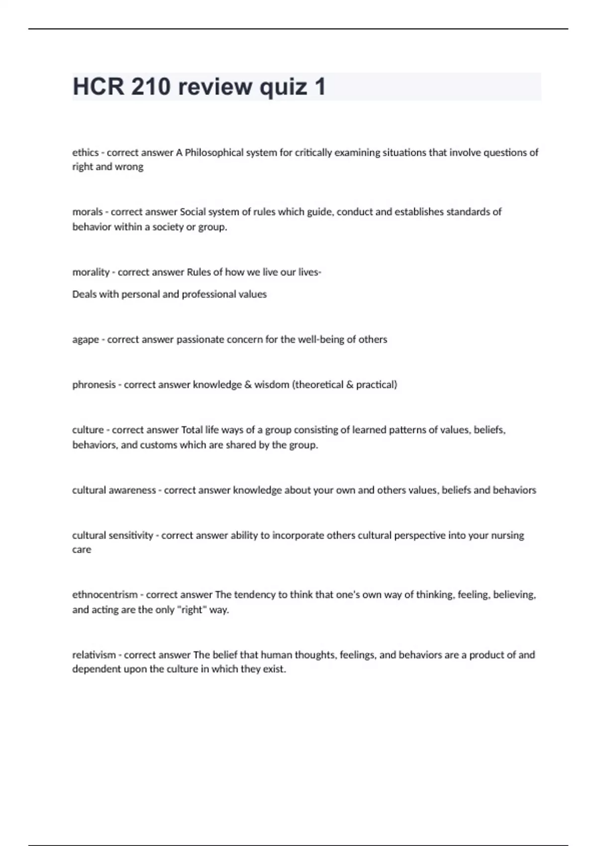 HCR 210 review quiz 1ethics - correct answer A Philosophical system for critically examining situations that involve questions of right and wrong morals - correct answer Social system of rules which guide, conduct and establishes standards of behavior within a society or group. morality - correct answer Rules of how we live our lives- Deals with personal and professional values agape - correct answer passionate concern for the well-being of others phronesis - correct answer knowledge & wisdom (theoretical & practical) culture - correct answer Total life ways of a group consisting of learned patterns of values, beliefs, behaviors, and customs which are shared by the group. cultural awareness - correct answer knowledge about your own and others values, beliefs and behaviors cultural sensitivity - correct answer ability to incorporate others cultural perspective into your nursing care