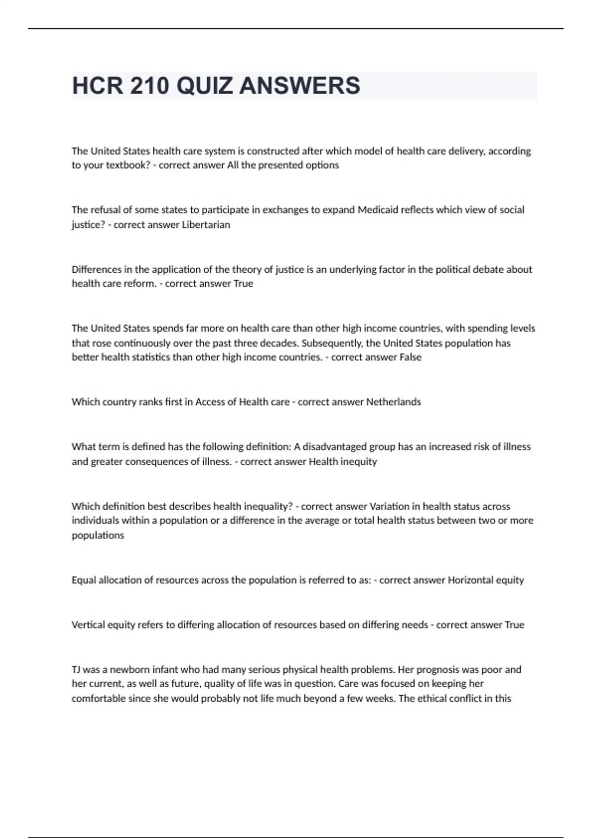 HCR 210 QUIZ ANSWERSThe United States health care system is constructed after which model of health care delivery, according to your textbook? - correct answer All the presented options The refusal of some states to participate in exchanges to expand Medicaid reflects which view of social justice? - correct answer Libertarian Differences in the application of the theory of justice is an underlying factor in the political debate about health care reform. - correct answer True The United States spends far more on health care than other high income countries, with spending levels that rose continuously over the past three decades. Subsequently, the United States population has better health statistics than other high income countries. - correct answer False Which country ranks first in Access of Health care - correct answer Netherlands What term is defined has the following definition: A disadvantaged group has an increased risk of illness and greater consequences of illness. - correct answer Health inequity Which definition best describes health inequality? - correct answer Variation in health status across individuals within a population or a difference in the average or total health status between two or more populations Equal allocation of resources across the population is referred to as: - correct answer Horizontal equity Vertical equity refers to differing allocation of resources based on differing needs - correct answer True TJ was a newborn infant who had many serious physical health problems. Her prognosis was poor and her current, as well as future, quality of life was in question. Care was focused on keeping her comfortable since she would probably not life much beyond a few weeks. The ethical conflict in this