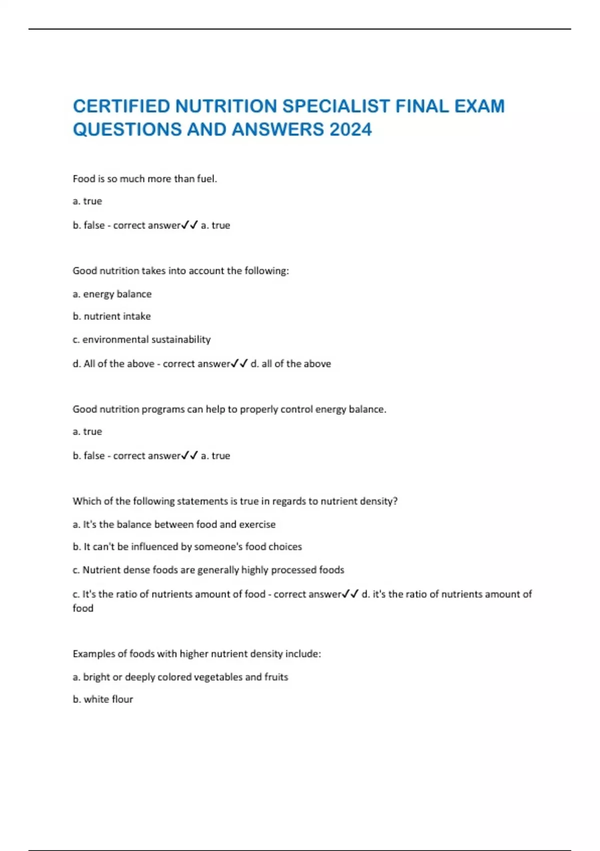 CERTIFIED NUTRITION SPECIALIST FINAL EXAM QUESTIONS AND ANSWERS 2024