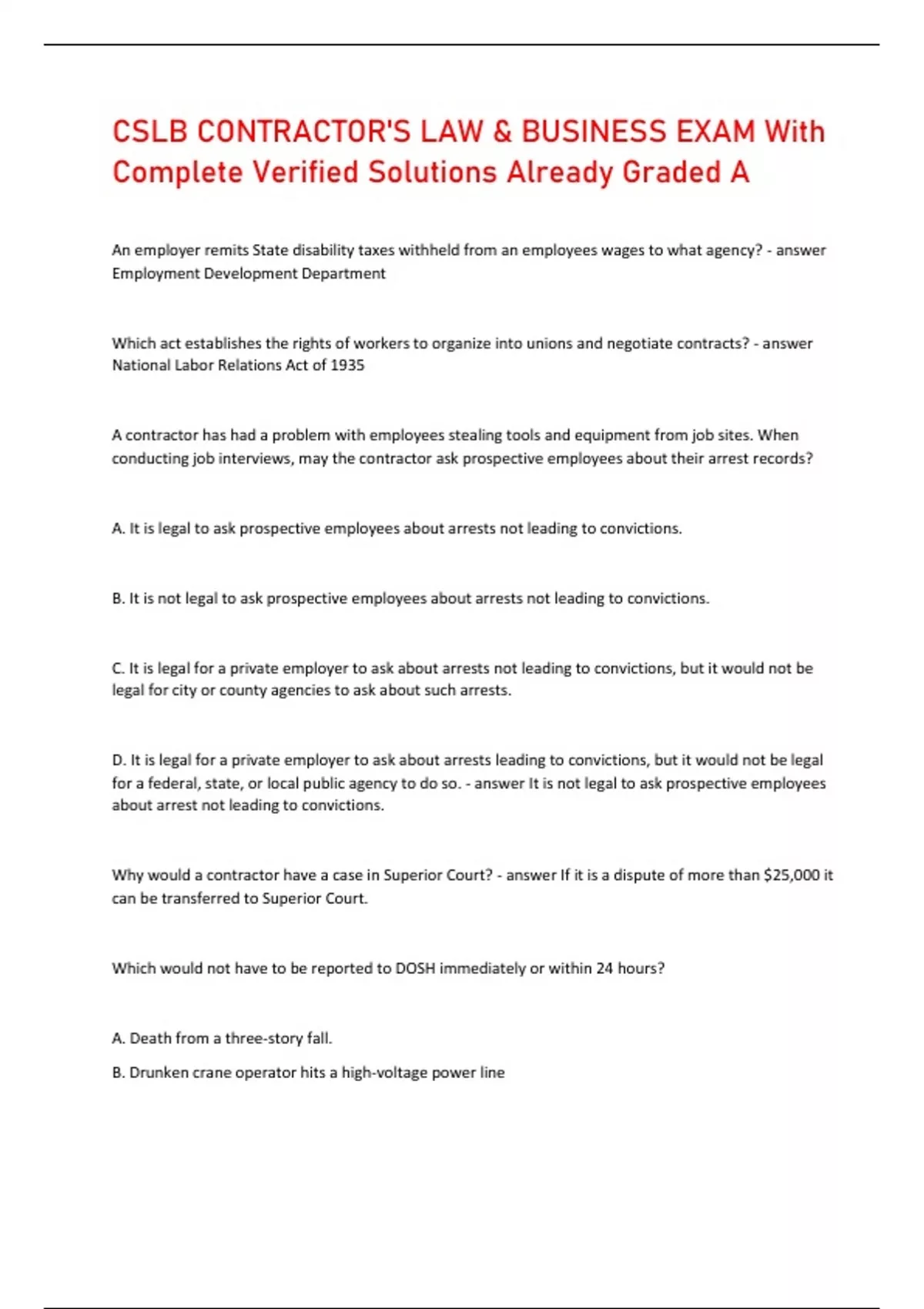 CSLB CONTRACTOR'S LAW & BUSINESS EXAM With Complete Verified Solutions Already Graded A