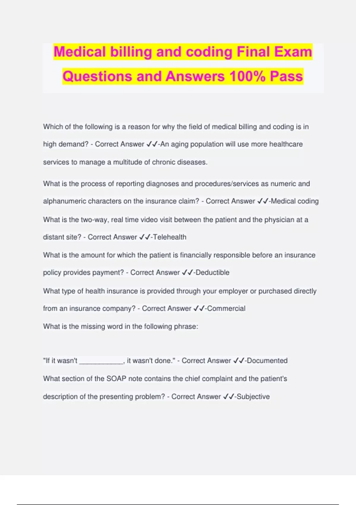 Medical billing and coding Final Exam Questions and Answers 100% Pass Which of the following is a reason for why the field of medical billing and coding is in high demand? - Correct Answer ️️ -An aging population will use more healthcare services to manage a multitude of chronic diseases. What is the process of reporting diagnoses and procedures/services as numeric and alphanumeric characters on the insurance claim? - Correct Answer ️️ -Medical coding What is the two-way, real time video visit between the patient and the physician at a distant site? - Correct Answer ️️ -Telehealth What is the amount for which the patient is financially responsible before an insurance policy provides payment? - Correct Answer ️️ -Deductible What type of health insurance is provided through your employer or purchased directly from an insurance company? - Correct Answer ️️ -Commercial What is the missing word in the following phrase: "If it wasn't ___________, it wasn't done." - Correct Answer ️️ -Documented What section of the SOAP note contains the chief complaint and the patient's description of the presenting problem? - Correct Answer ️️ -Subjective What is health information in a digital format that is created and shared by providers across more than one healthcare setting? - Correct Answer ️️ -Electronic health record (EHR) What is the reimbursement method where one payment covers all services during an episode of care? - Correct Answer ️️ -Bundled payment What is a written order from your primary care provider for you to see a specialist or get certain medical services? - Correct Answer ️️ -Referral What health plans are designed to put more responsibility on the employee for their healthcare spending? - Correct Answer ️️ -Consumer-directed health plans In a physician practice, revenue cycle management is also called what? - Correct Answer ️️ -Accounts receivable What is the computer-to-computer transfer of data between providers and third-party payers? - Correct Answer ️️ -Electronic data interchange (EDI) What type of claim was never entered into the computer system of the insurance company because it failed to meet specific data requirements? - Correct Answer ️️ - Rejected claim What is the maximum amount that an insurer will reimburse for a covered service or procedure? - Correct Answer ️️ -Allowable charge What is price transparency in healthcare? - Correct Answer ️️ -Patients are informed about what charges to expect. What is the term for an individual who has not reached the age of m