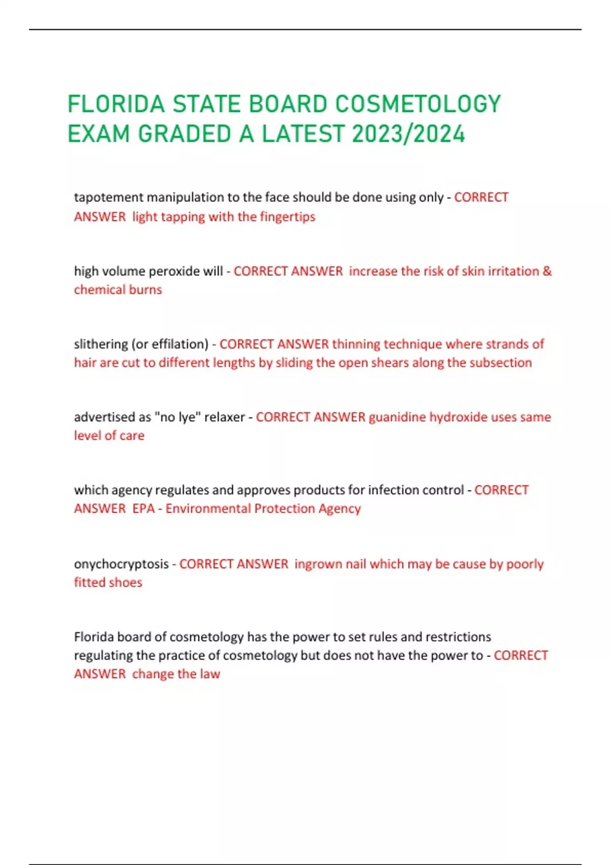 FLORIDA STATE BOARD COSMETOLOGY EXAM GRADED A LATEST 2023/202