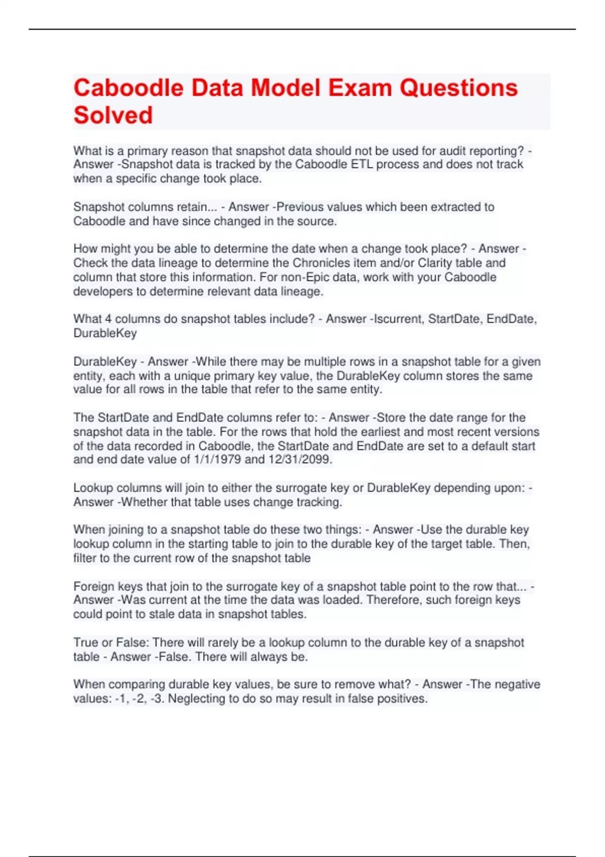 Caboodle Data Model Exam Questions Solved What is a primary reason that snapshot data should not be used for audit reporting? - Answer -Snapshot data is tracked by the Caboodle ETL process and does not track when a specific change took place. Snapshot columns retain... - Answer -Previous values which been extracted to Caboodle and have since changed in the source. How might you be able to determine the date when a change took place? - Answer -Check the data lineage to determine the Chronicles item and/or Clarity table and column that store this information. For non‐Epic data, work with your Caboodle developers to determine relevant data lineage. What 4 columns do snapshot tables include? - Answer -Iscurrent, StartDate, EndDate, DurableKey DurableKey - Answer -While there may be multiple rows in a snapshot table for a given entity, each with a unique primary key value, the DurableKey column stores the same value for all rows in the table that refer to the same entity. The StartDate and EndDate columns refer to: - Answer -Store the date range for the snapshot data in the table. For the rows that hold the earliest and most recent versions of the data recorded in Caboodle, the StartDate and EndDate are set to a default start and end date value of 1/1/1979 and 12/31/2099. Lookup columns will join to either the surrogate key or DurableKey depending upon: - Answer -Whether that table uses change tracking. When joining to a snapshot table do these two things: - Answer -Use the durable key lookup column in the starting table to join to the durable key of the target table. Then, filter to the current row of the snapshot table Foreign keys that join to the surrogate key of a snapshot table point to the row that... - Answer -Was current at the time the data was loaded. Therefore, such foreign keys could point to stale data in snapshot tables. True or False: There will rarely be a lookup column to the durable key of a snapshot table - Answer -False. There will always be. When comparing durable key values, be sure to remove what? - Answer -The negative values: ‐1, ‐2, ‐3. Neglecting to do so may result in false positives. True or False: Any change to patient data in Clarity will generate a new row in PatientDim after the next extract. - Answer -False. Assuming the data is extracted to Caboodle, only changes to snapshot columns would generate a new row in PatientDim. Consider the following query: SELECT DurableKey FROM <TableName> Which of the following statements are true? A. This query will only run if <TableName>is a snapshot table. B. This query will run regardless of whether <TableName> has change tracking. C. The value in the DurableKey column could repeat in multiple rows of the results. D. There is no table in Caboodle for which this query will run. - Answer -A and C