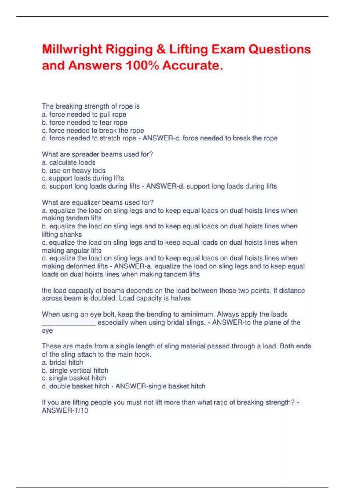 Millwright Rigging & Lifting Exam Questions and Answers 100% Accurate