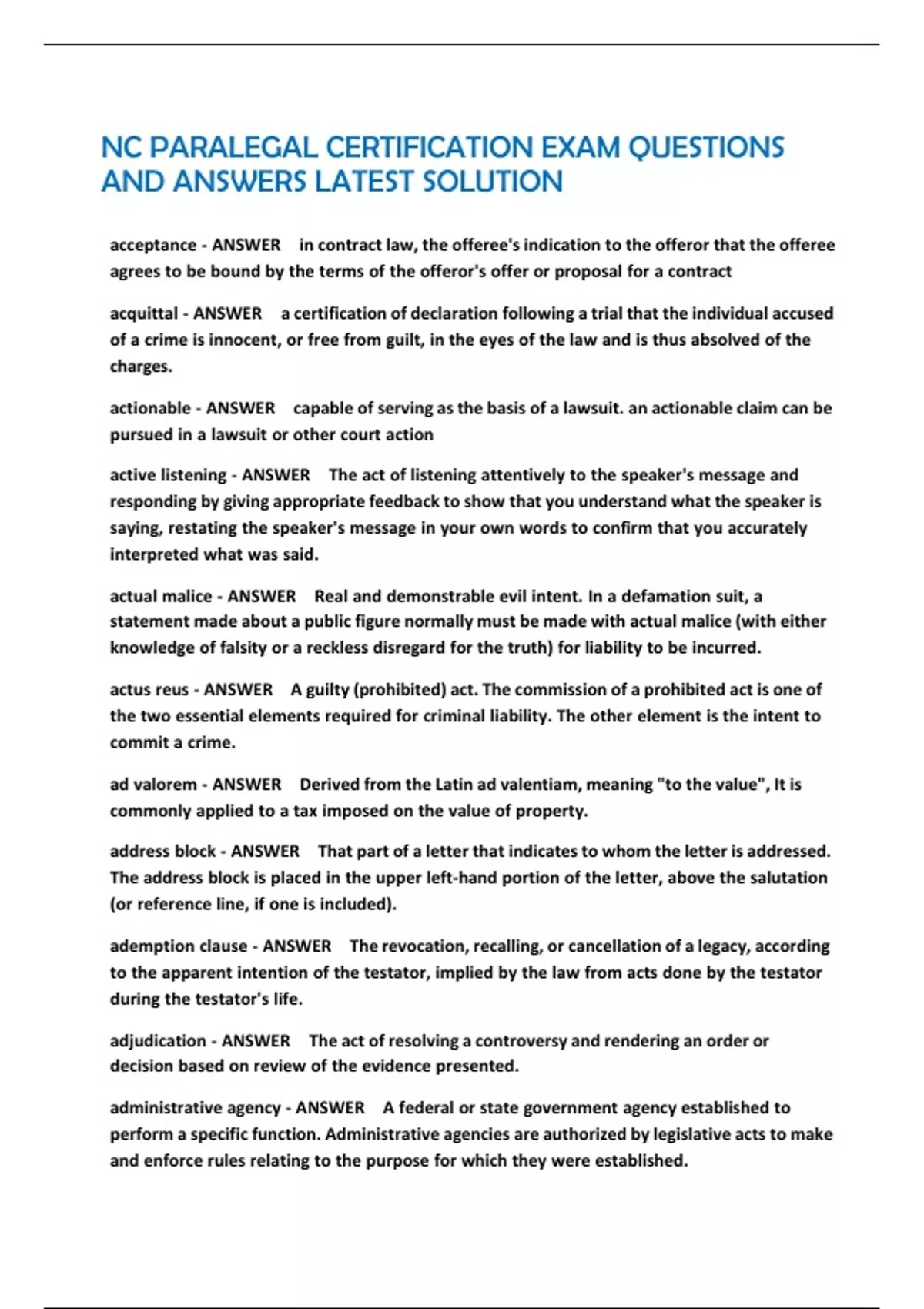 NC PARALEGAL CERTIFICATION EXM QUESTONS AND ANS
