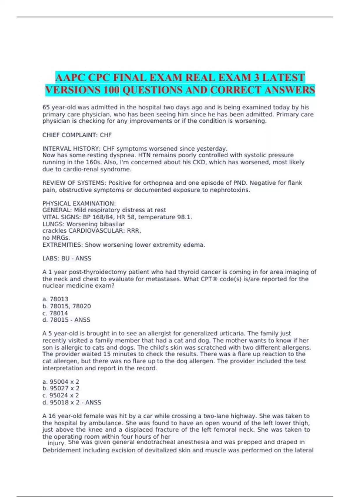 AAPC CPC FINAL EXAM REAL EXAM 3 LATEST VERSIONS 100 QUESTIONS AND CORRECT ANSWERS