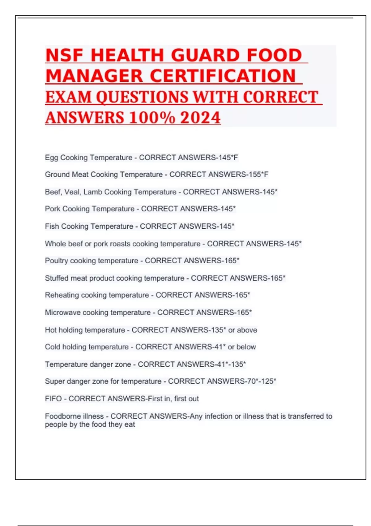 NSF HEALTH GUARD FOOD MANAGER CERTIFICATION EXAM QUESTIONS WITH CORRECT ANSWERS 100% 2024