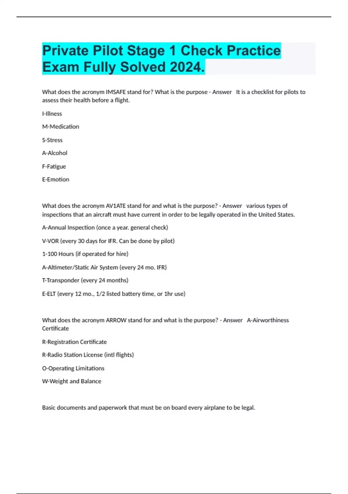 What does the acronym IMSAFE stand for? What is the purpose - Answer It is a checklist for pilots to assess their health before a flight. I-Illness M-Medication S-Stress A-Alcohol F-Fatigue E-Emotion What does the acronym AV1ATE stand for and what is the purpose? - Answer various types of inspections that an aircraft must have current in order to be legally operated in the United States. A-Annual Inspection (once a year. general check) V-VOR (every 30 days for IFR. Can be done by pilot) 1-100 Hours (if operated for hire) A-Altimeter/Static Air System (every 24 mo. IFR) T-Transponder (every 24 months) E-ELT (every 12 mo., 1/2 listed battery time, or 1hr use) What does the acronym ARROW stand for and what is the purpose? - Answer A-Airworthiness Certificate R-Registration Certificate R-Radio Station License (intl flights) O-Operating Limitations W-Weight and Balance Basic documents and paperwork that must be on board every airplane to be legal.