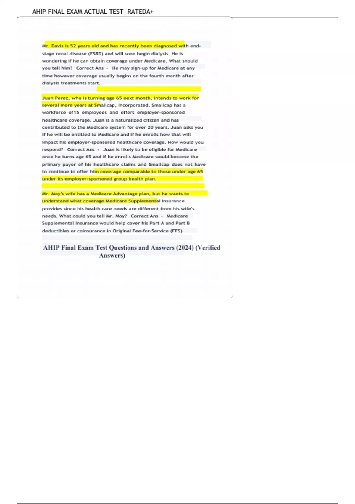 Mr. Davis is 52 years old and has recently been diagnosed with end- stage renal disease (ESRD) and will soon begin dialysis. He is wondering if he can obtain coverage under Medicare. What should you tell him? Correct Ans - He may sign-up for Medicare at any time however coverage usually begins on the fourth month after dialysis treatments start. Juan Perez, who is turning age 65 next month, intends to work for several more years at Smallcap, Incorporated. Smallcap has a workforce of15 employees and offers employer-sponsored healthcare coverage. Juan is a naturalized citizen and has contributed to the Medicare system for over 20 years. Juan asks you if he will be entitled to Medicare and if he enrolls how that will impact his employer-sponsored healthcare coverage. How would you respond? Correct Ans - Juan is likely to be eligible for Medicare once he turns age 65 and if he enrolls Medicare would become the primary payor of his healthcare claims and Smallcap does not have to continue to offer him coverage comparable to those under age 65 under its employer-sponsored group health plan. Mr. Moy's wife has a Medicare Advantage plan, but he wants to understand what coverage Medicare Supplemental Insurance provides since his health care needs are different from his wife's needs. What could you tell Mr. Moy? Correct Ans - Medicare Supplemental Insurance would help cover his Part A and Part B deductibles or coinsurance in Original Fee-for-Service (FFS) AHIP Final Exam Test Questions and Answers (2024) (Verified Answers) Medicare as well as possibly some services that Medicare does not cover. Mrs. Peňa is 66 years old, has coverage under an employer plan, and will retire next year. She heard she must enroll in Part B at the beginning of the year to ensure no gap in coverage. What can you tell her? Correct Ans - She may enroll at any time while she is covered under her employer plan, but she will have a special eight- month enrollment period after the last month on her employer plan that differs from the standard general enrollment period, during which she may enroll in Medicare Part B. Mrs. Chen will be 65 soon, has been a citizen for twelve years, has been employed full time, and paid taxes during that entire period. She is concerned that she will not qualify for coverage under part A because she was not born in the United States. What should you tell her? Correct Ans - Most individuals who are citizens and age 65 or over are covered under Part A by virtue of having paid Medicare taxes while working, though some may be covered as a result of paying monthly premiums. Mrs. Gonzalez is enrolled in Original Medicare and has a Medigap policy as well, but it provides no drug coverage. She would like to keep the coverage she has but replace her existing Medigap plan with one that provides drug coverage. What should you tell her? Correct Ans - Mrs. Gonzalez cannot purchase a Medigap plan that covers drugs, but she could keep her Medigap policy and enroll in a Part D prescription drug plan.