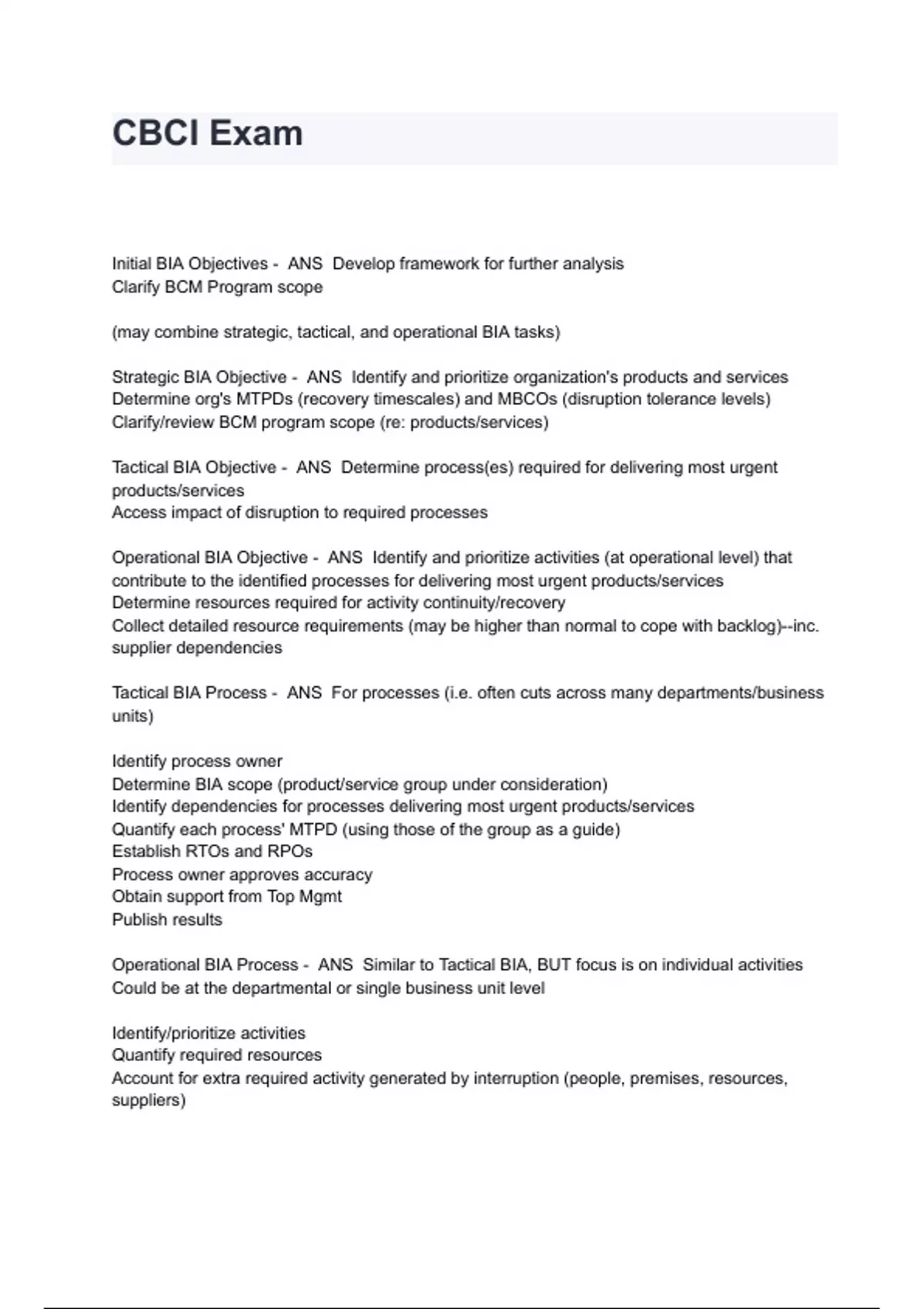 CBCI Exam Questions And Answers Initial BIA Objectives - ANS Develop framework for further analysis Clarify BCM Program scope (may combine strategic, tactical, and operational BIA tasks) Strategic BIA Objective - ANS Identify and prioritize organization's products and services Determine org's MTPDs (recovery timescales) and MBCOs (disruption tolerance levels) Clarify/review BCM program scope (re: products/services) Tactical BIA Objective - ANS Determine process(es) required for delivering most urgent products/services Access impact of disruption to required processes Operational BIA Objective - ANS Identify and prioritize activities (at operational level) that contribute to the identified processes for delivering most urgent products/services Determine resources required for activity continuity/recovery Collect detailed resource requirements (may be higher than normal to cope with backlog)--inc. supplier dependencies Tactical BIA Process - ANS For processes (i.e. often cuts across many departments/business units) Identify process owner Determine BIA scope (product/service group under consideration) Identify dependencies for processes delivering most urgent products/services Quantify each process' MTPD (using those of the group as a guide) Establish RTOs and RPOs Process owner approves accuracy Obtain support from Top Mgmt Publish results Operational BIA Process - ANS Similar to Tactical BIA, BUT focus is on individual activities Could be at the departmental or single business unit level Identify/prioritize activities Quantify required resources Account for extra required activity generated by interruption (people, premises, resources, suppliers) Process owner approves Top management support of conclusions Initial BIA Outcome - ANS Organizational structure of products and services, processes and activities Strategic BIA Outcome - ANS Validation OR modification of BCM Program scope Approved MTPD for each product/service group Approved organizational MBCO List of organization's most urgent products & services (Optional: draft RTOs) Tactical BIA Outcome - ANS List of processes that deliver organization's most urgent products/services MTPD for each process (estimated RTO and RPO) MTPD justifications Operational BIA Outcome - ANS List of internal and external resource requirements for recovery and continuity of most urgent products/services