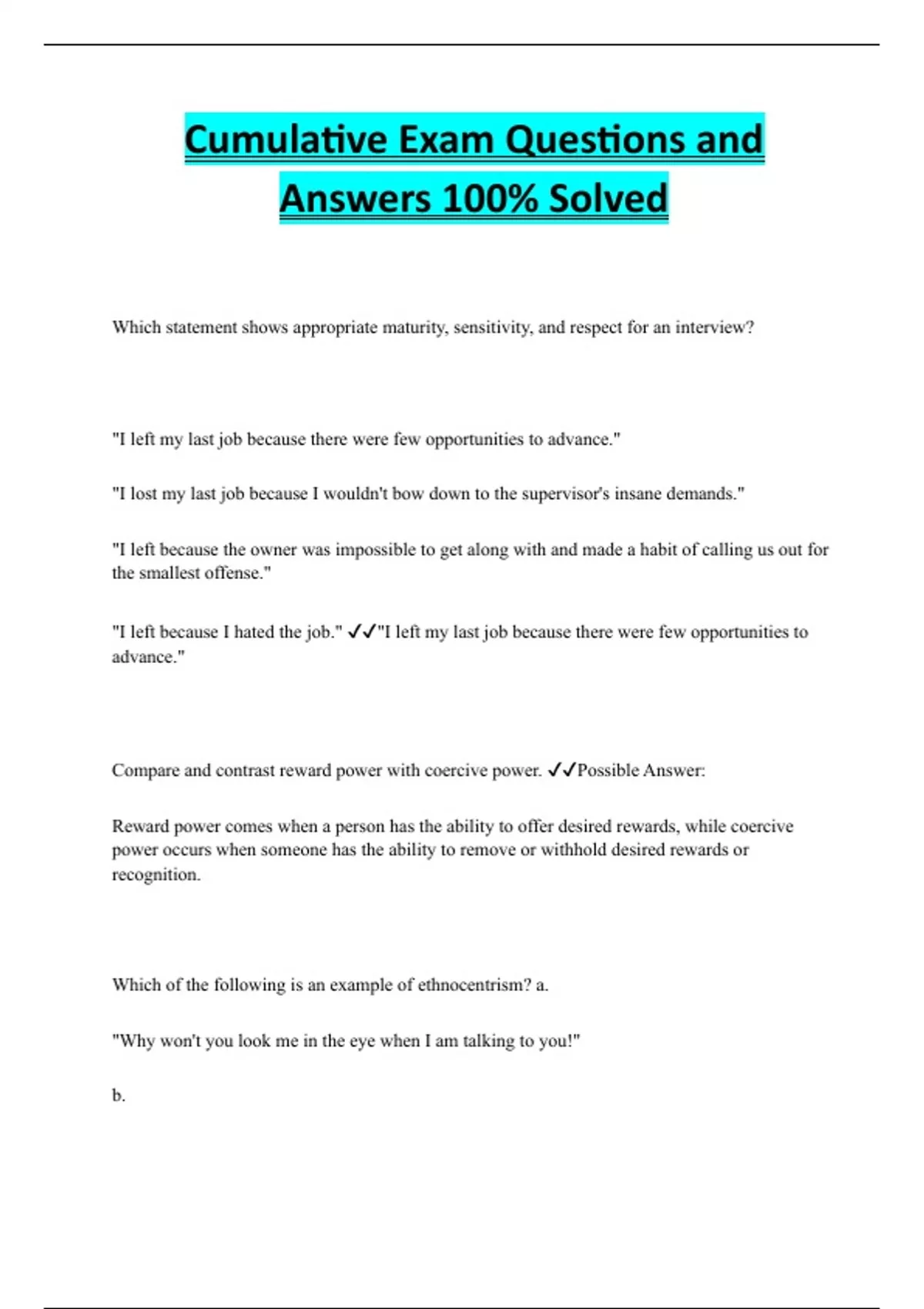 Cumulative Exam Questions and Answers 100% Solved Which statement shows appropriate maturity, sensitivity, and respect for an interview? "I left my last job because there were few opportunities to advance." "I lost my last job because I wouldn't bow down to the supervisor's insane demands." "I left because the owner was impossible to get along with and made a habit of calling us out for the smallest offense." "I left because I hated the job." "I left my last job because there were few opportunities to advance." Compare and contrast reward power with coercive power. Possible Answer: Reward power comes when a person has the ability to offer desired rewards, while coercive power occurs when someone has the ability to remove or withhold desired rewards or recognition. Which of the following is an example of ethnocentrism? a. "Why won't you look me in the eye when I am talking to you!"