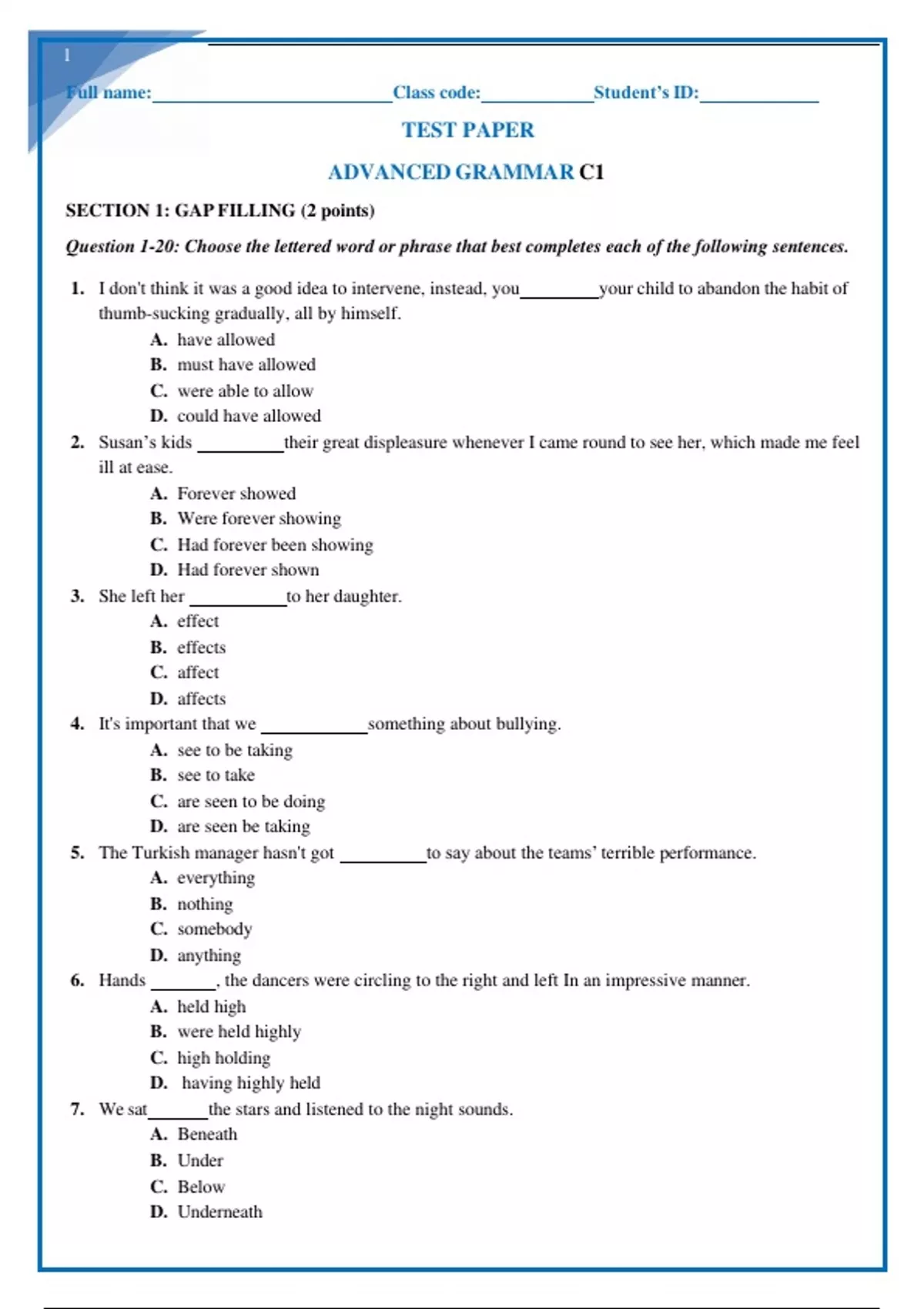 advanced grammar test questions and answers 2024