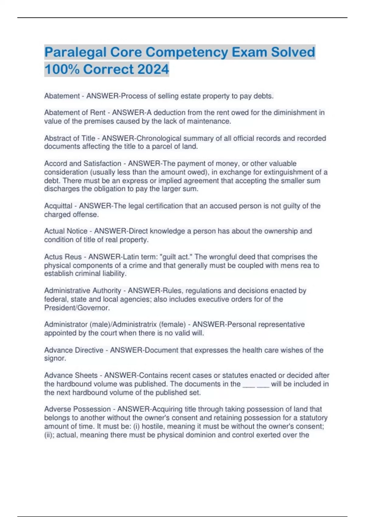 Paralegal Core Competency Exm Solved 100% Correc